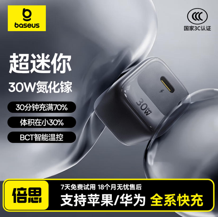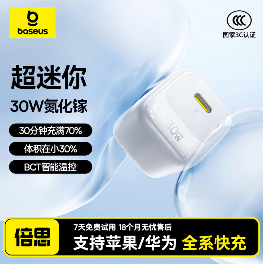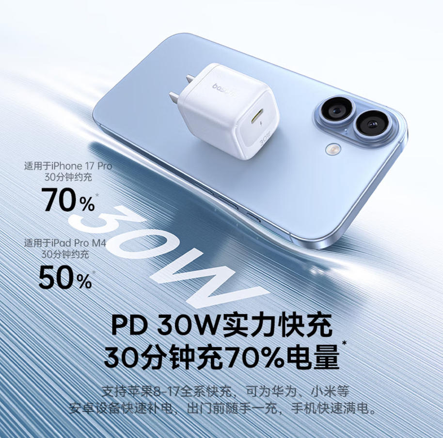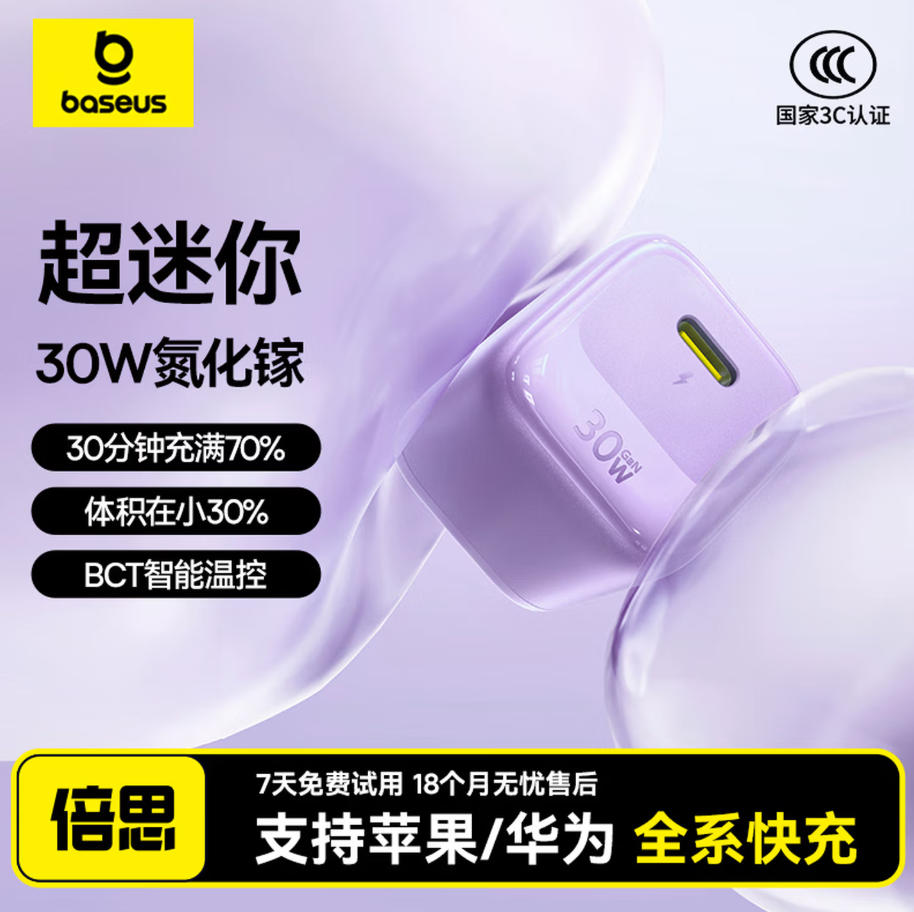 君航科技 倍思 小冰充30W 氮化镓 充电器 C口充电器 仪器设备 充电 适用苹果17充电头 快充 16/15/14/13手机iPad 插头 黑色 白色 紫色 蓝色