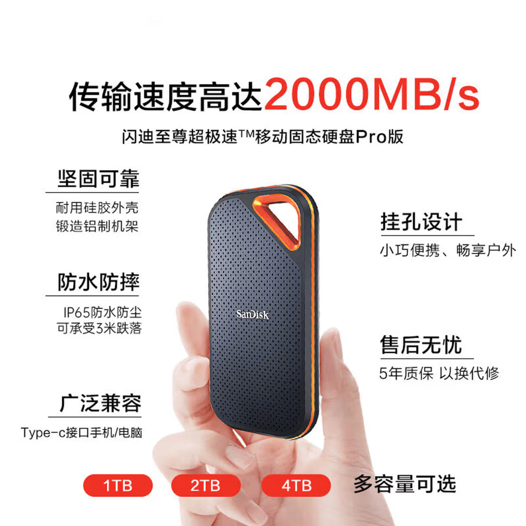 君航科技 闪迪(SanDisk)2TB Nvme移动固态硬盘(PSSD)E81至尊超极速Pro版SSD 读速2000MB/s 手机直连笔记本外接 三防保护