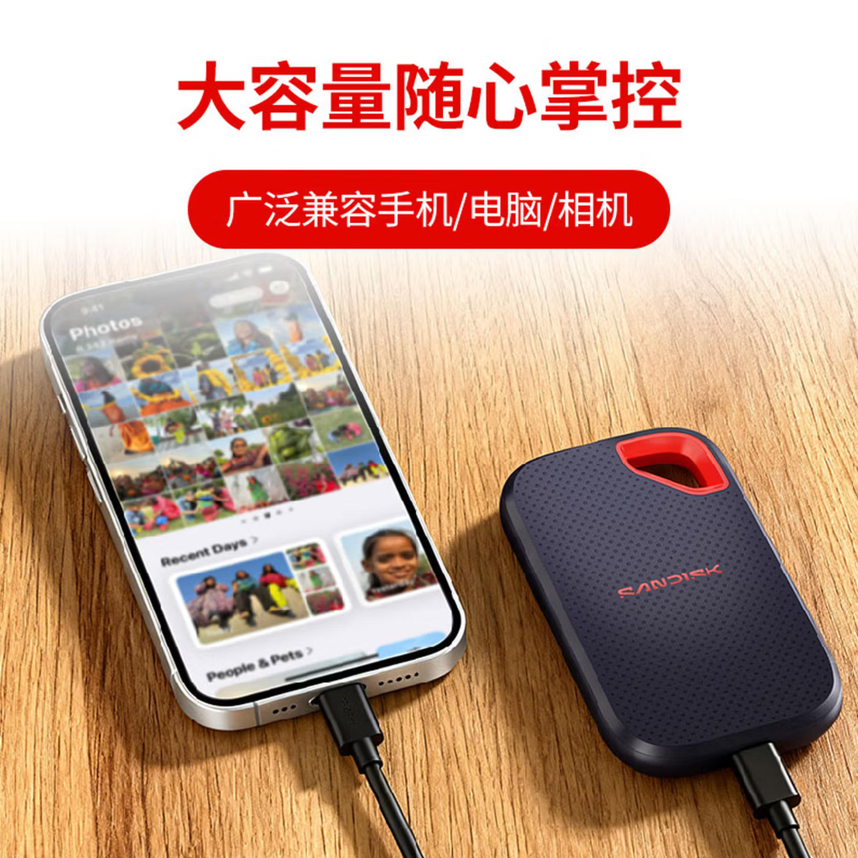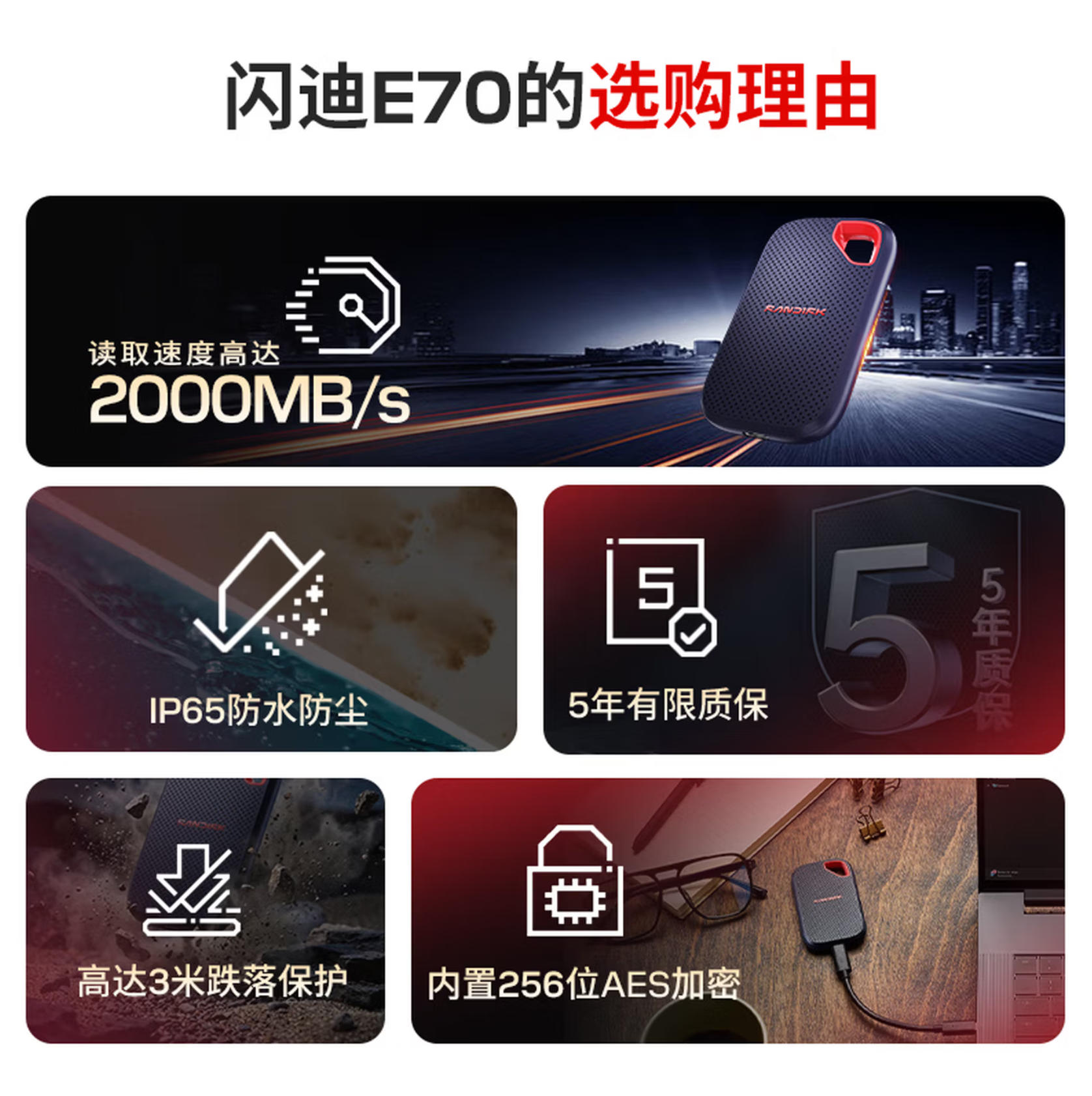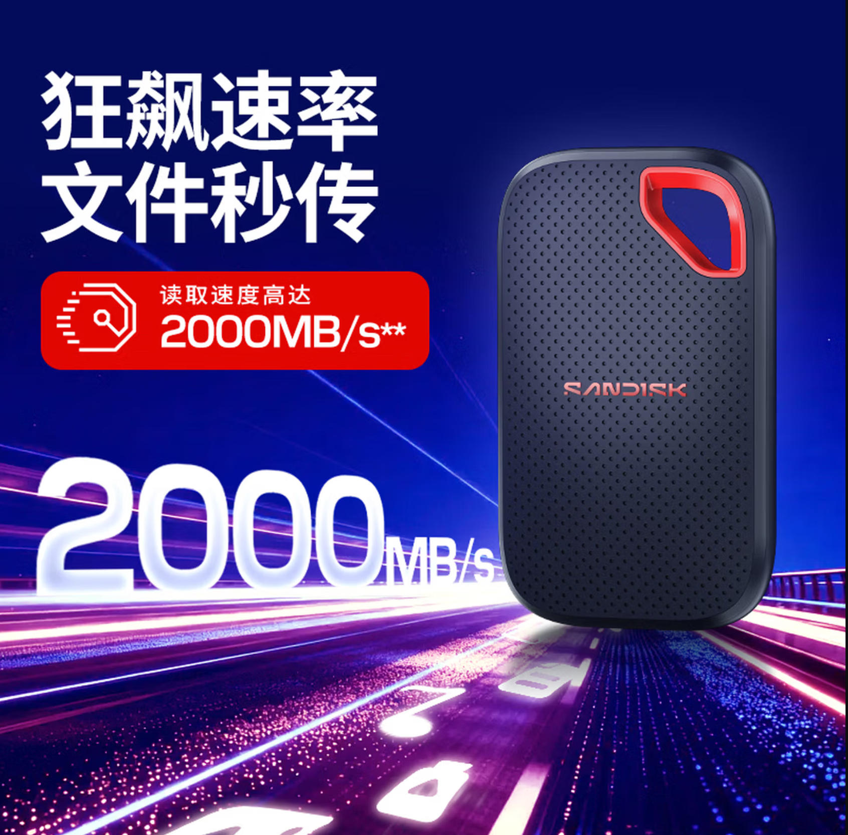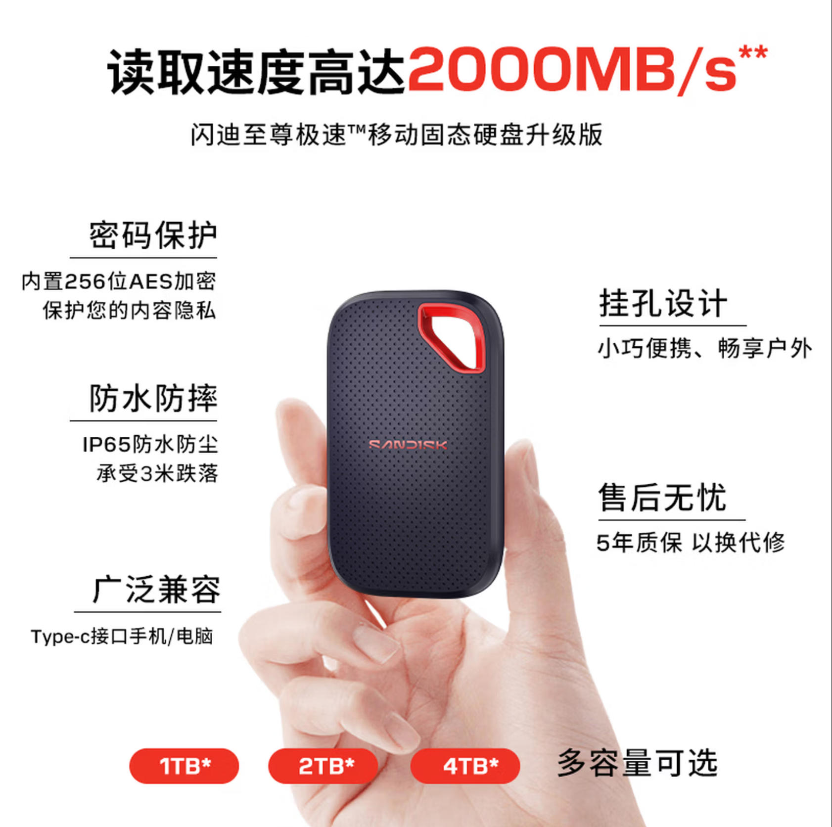 君航科技 闪迪(SanDisk)1TB Type-c USB3.2 NVMe移动固态硬盘(PSSD)E70升级版 读速2000MB/s 三防保护 兼容手机电脑平板