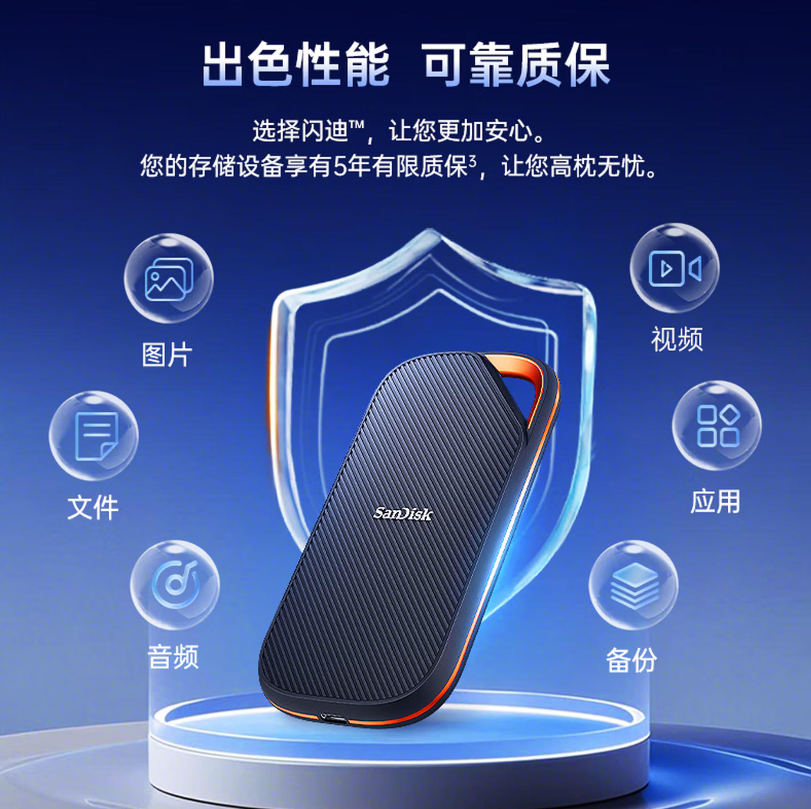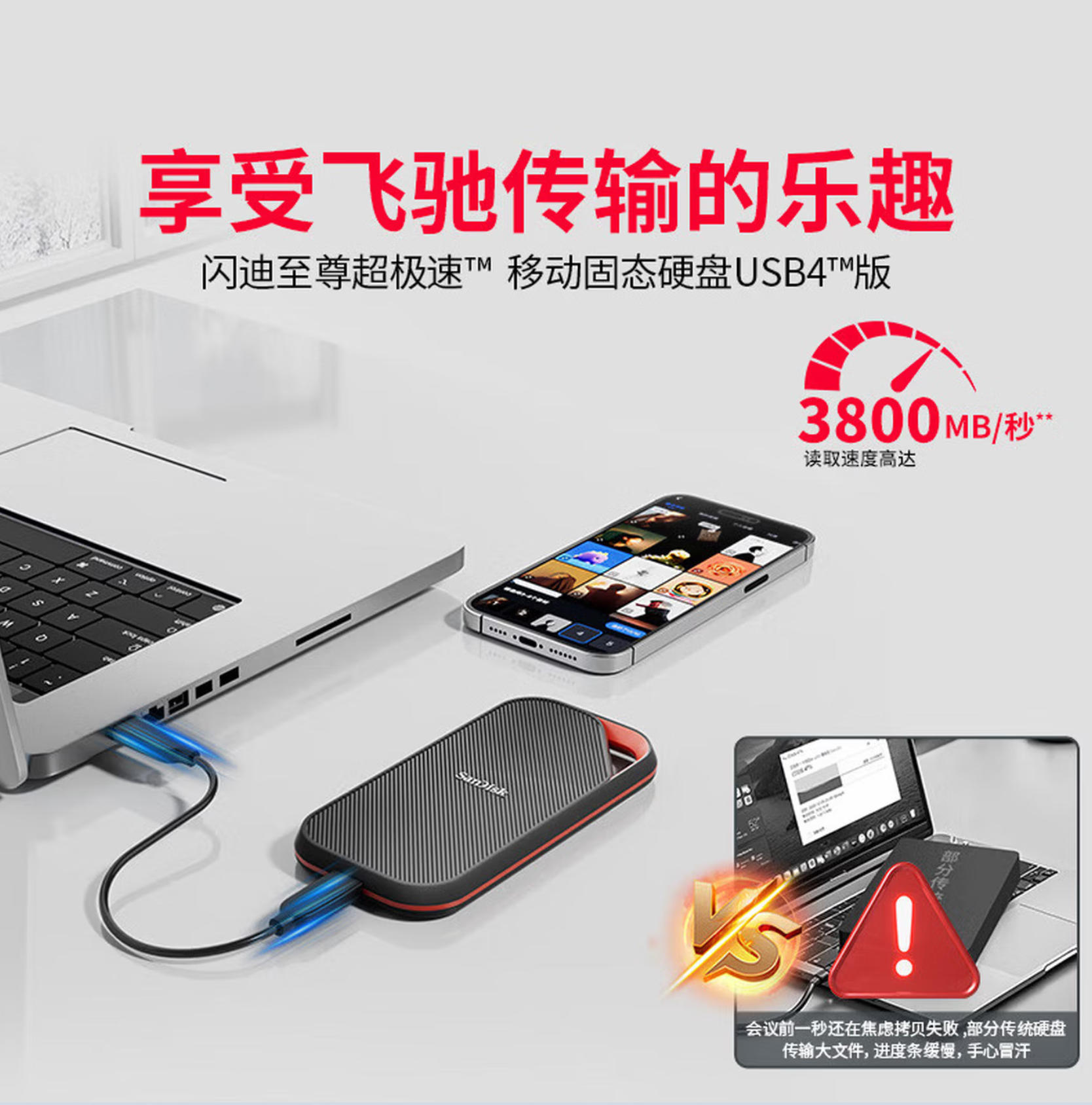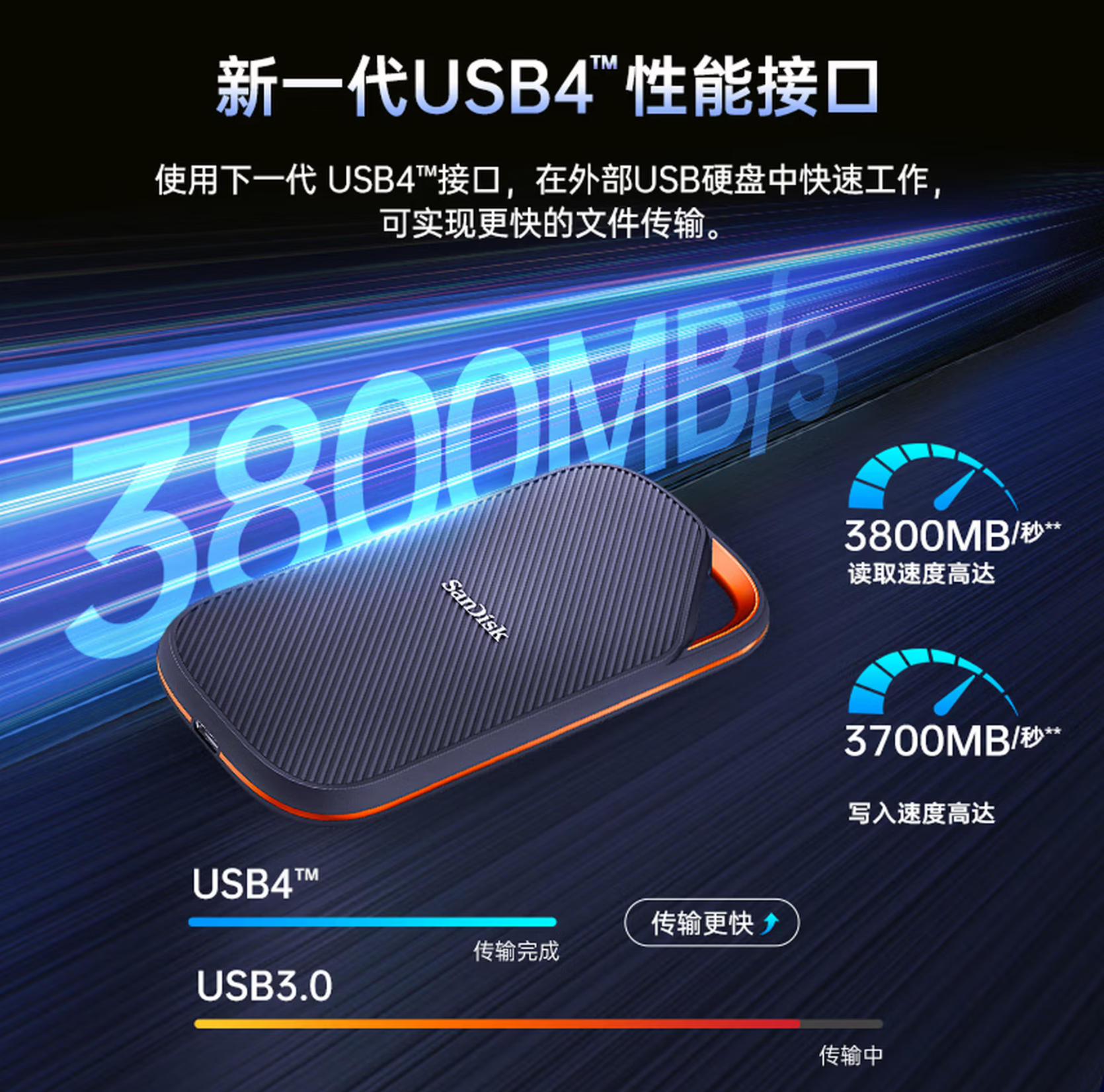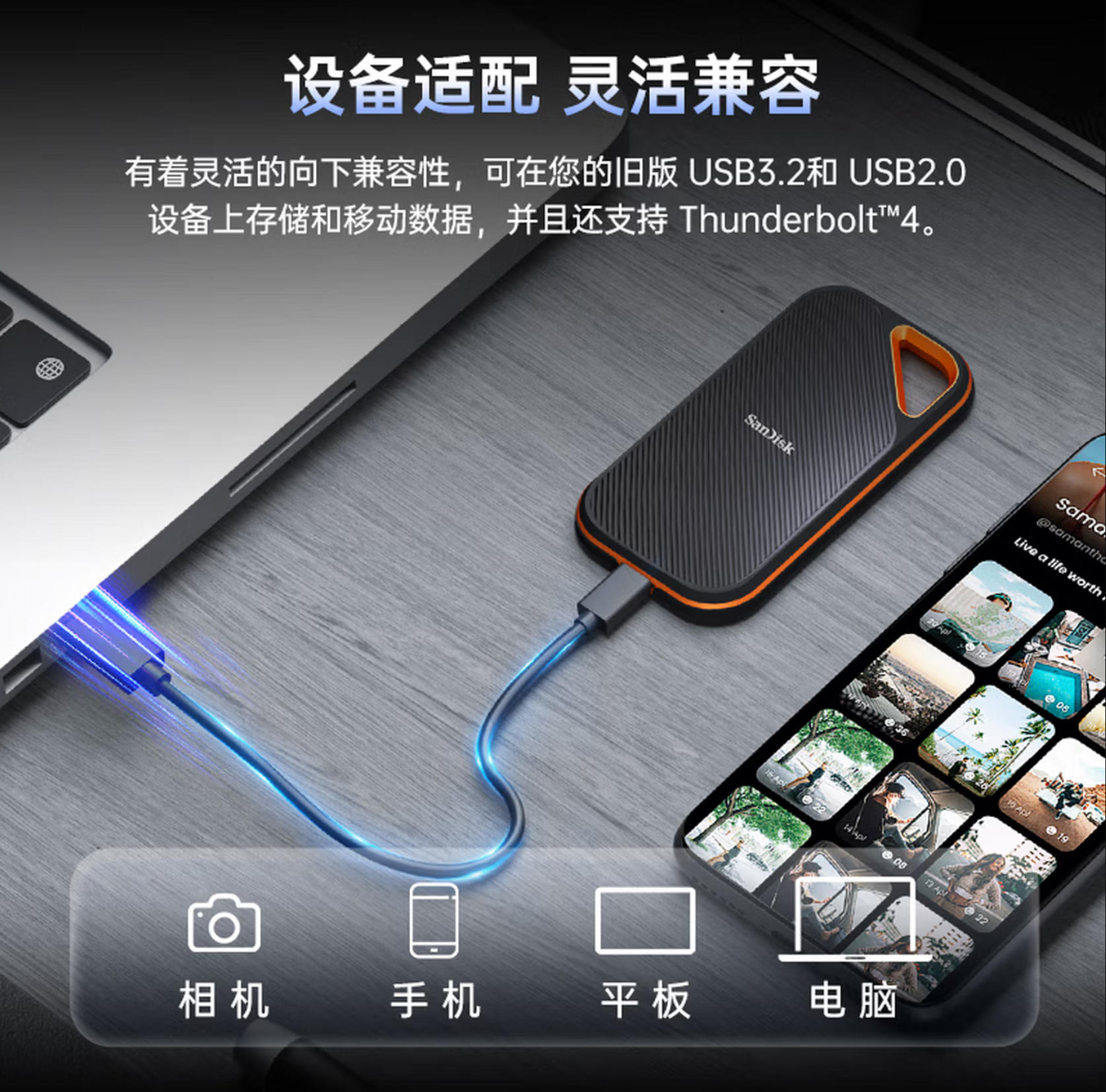 君航科技 闪迪(SanDisk)2TB 移动固态硬盘(PSSD)E82 读3800MB/s 写3700MB/s 兼容雷电4 type-c 手机电脑外接
