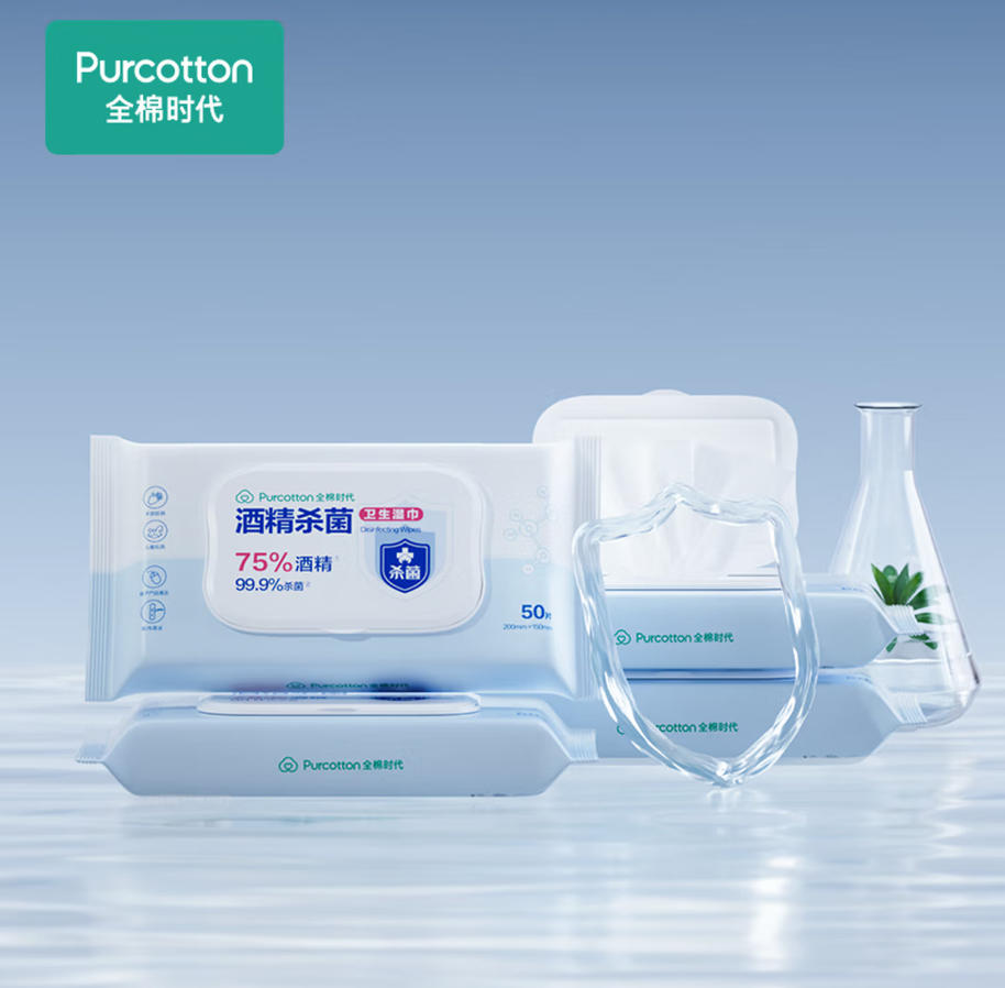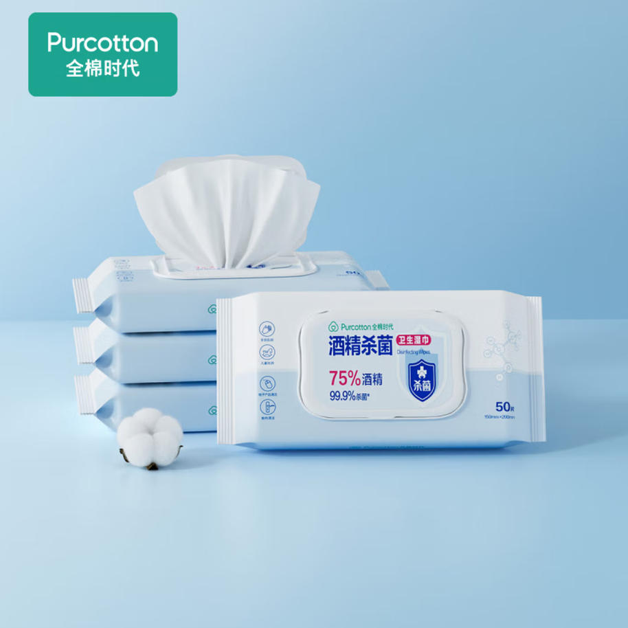 莱英办公 全棉时代 酒精湿纸巾75%酒精杀菌手口一次性大包实惠装15*20cm 50抽*4包