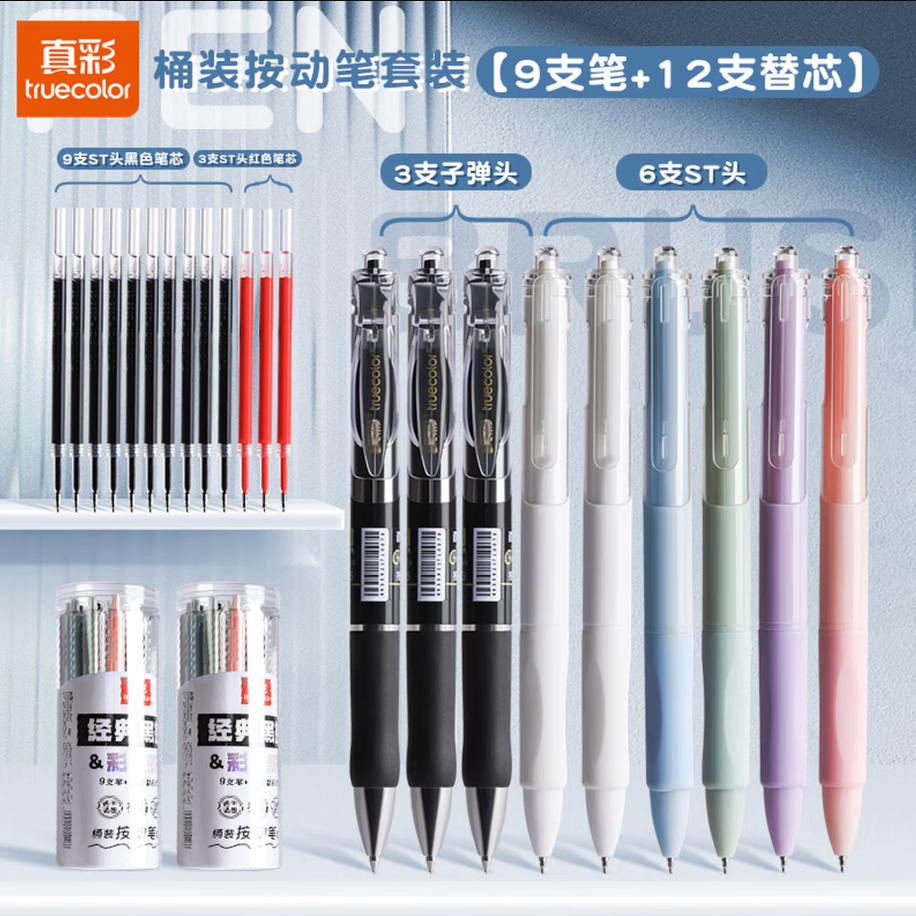 森淼办公 真彩(TRUECOLOR)9支按动笔 中性笔 刷题笔 速干 st笔头 高颜值 考试 黑笔 签字 顺滑笔 黑色 按压式 0.5笔芯 1209