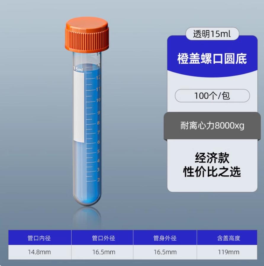 塑料离心管 15ml螺口橙盖圆底(100个/袋) 带刻度离心管/EP管 pcr管