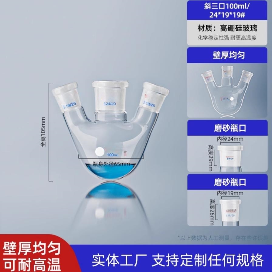 玻璃三口烧瓶 圆底球形蒸馏瓶 高硼硅 斜三口烧瓶 100ml/24*19*19#
