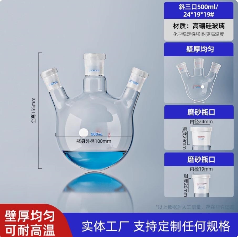 玻璃三口烧瓶 圆底球形蒸馏瓶 高硼硅 斜三口烧瓶 500ml/24*19*19#