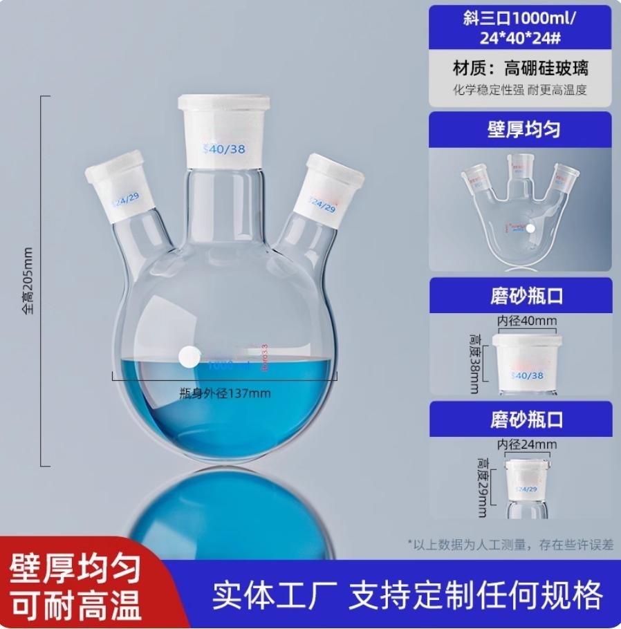 玻璃三口烧瓶 圆底球形蒸馏瓶 高硼硅 斜三口烧瓶 1000ml/24*40*24#