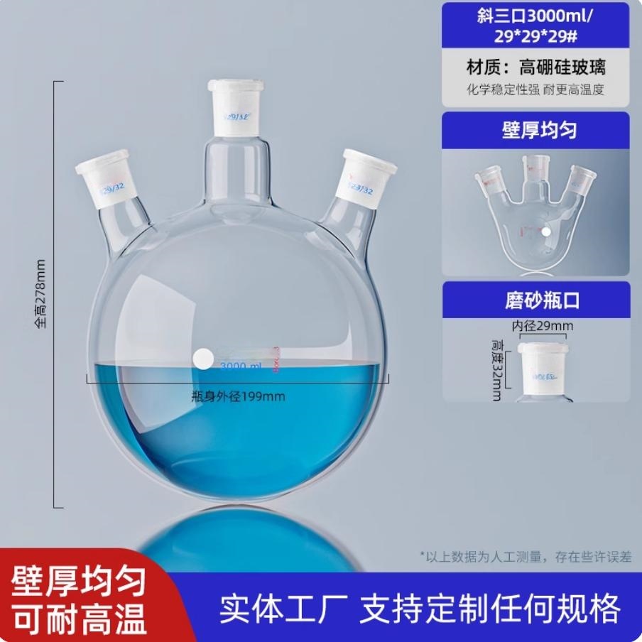 玻璃三口烧瓶 圆底球形蒸馏瓶 高硼硅 斜三口烧瓶 3000ml/29*29*29#