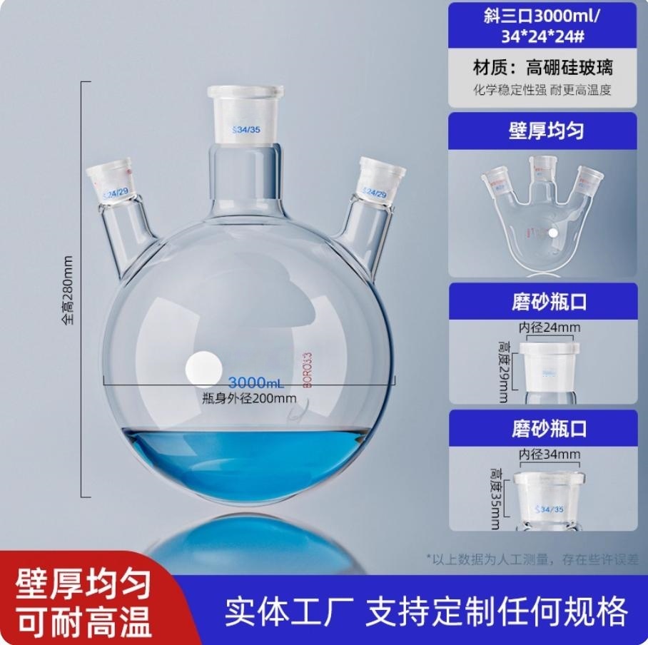 玻璃三口烧瓶 圆底球形蒸馏瓶 高硼硅 斜三口烧瓶 3000ml/34*24*24#