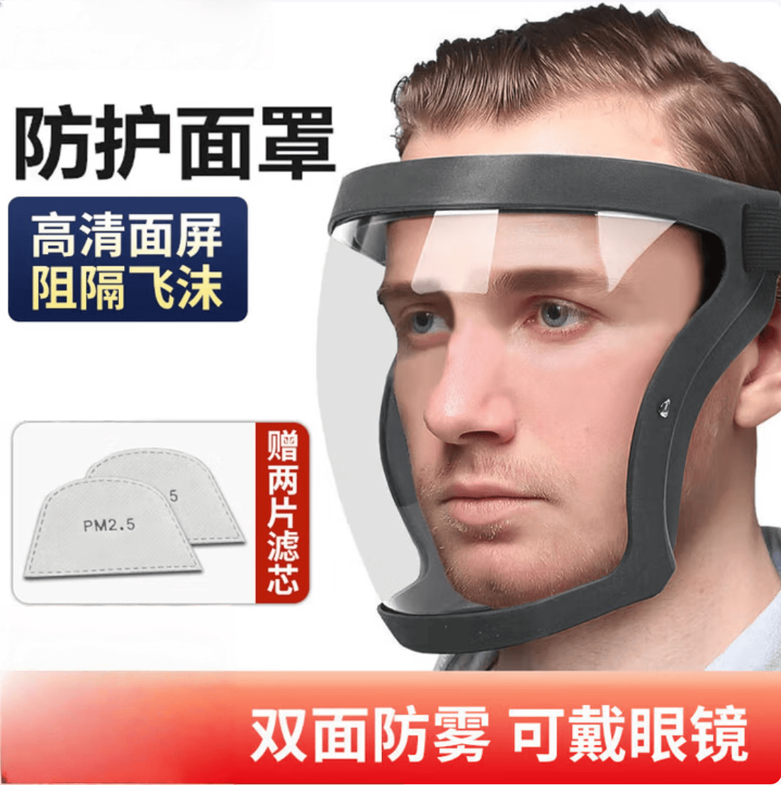 防护面罩 高透明防雾全面罩防水防尘保护面屏 黑框透明