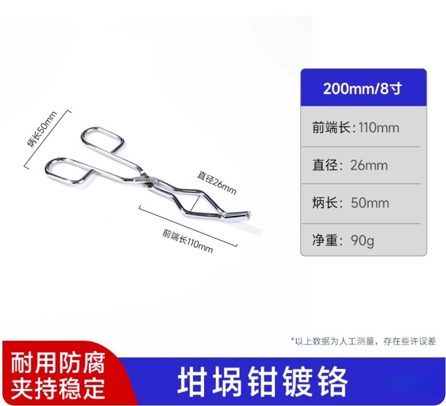 镀铬坩埚钳 马弗炉坩埚钳 圆钢镀铬灰皿钳不锈钢长柄坩埚钳子高硬度陶瓷坩埚夹子8寸200mm