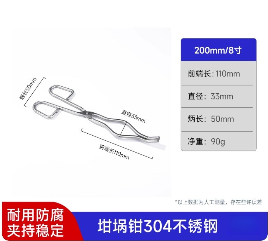 不锈钢坩埚钳 马弗炉坩埚钳 圆钢不锈钢灰皿钳不锈钢长柄坩埚钳子高硬度陶瓷坩埚夹子8寸200mm