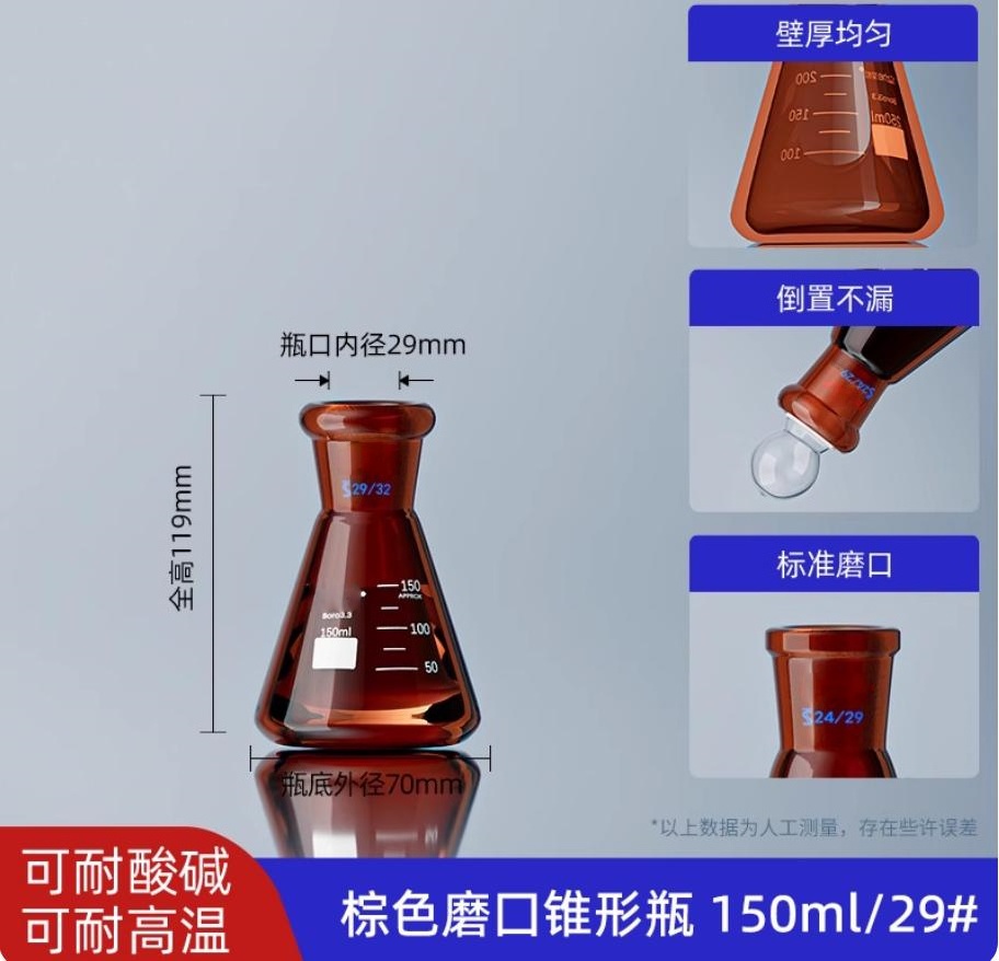 棕色磨口三角瓶棕标准口棕磨口三角烧瓶(棕磨口锥形瓶)150ml*29#