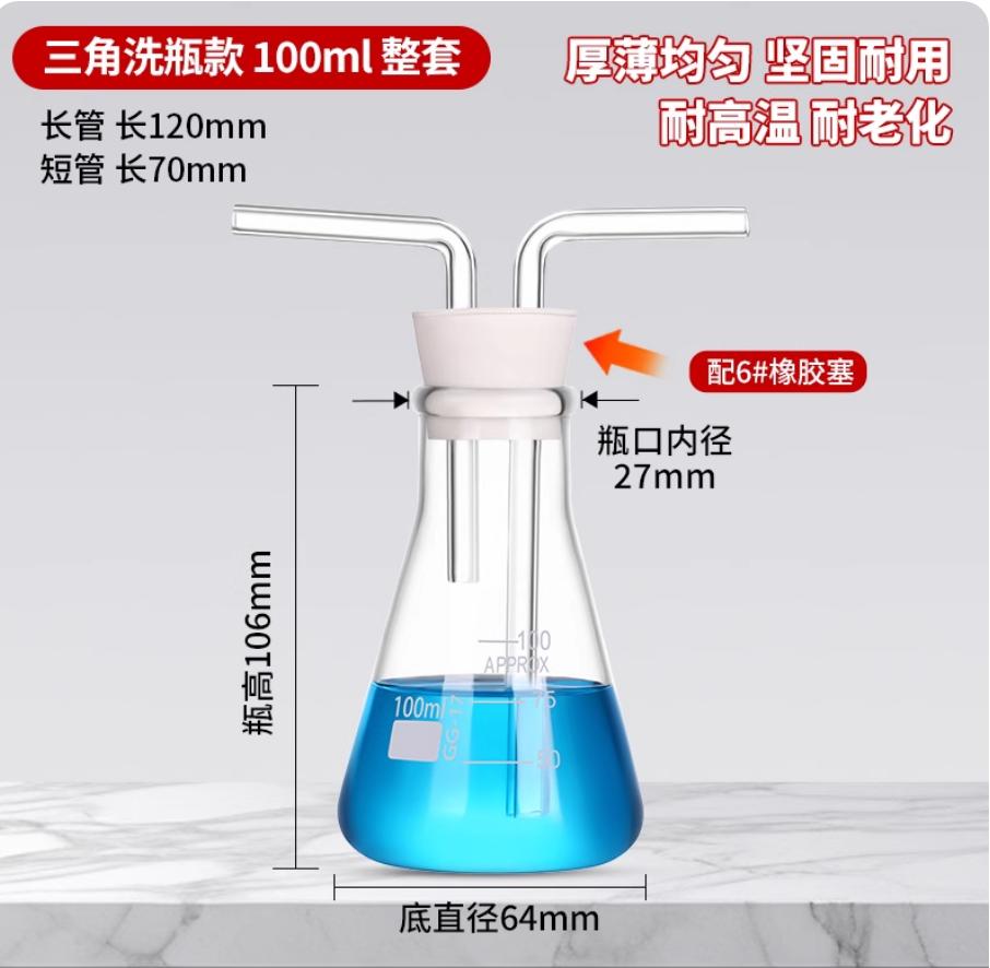 100ml玻璃洗气瓶气体洗瓶洗气过滤装置锥形瓶带双孔橡胶塞直角导管三角洗瓶特式直管孟氏多孔洗瓶锥形洗气瓶