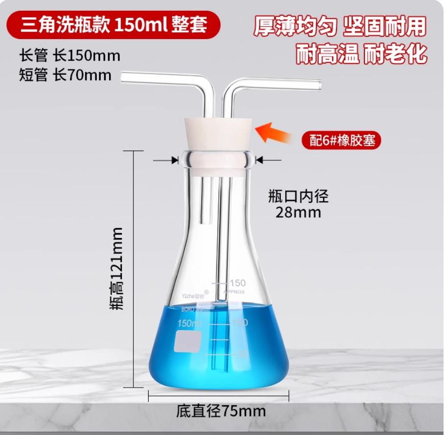 150ml玻璃洗气瓶气体洗瓶洗气过滤装置锥形瓶带双孔橡胶塞直角导管三角洗瓶特式直管孟氏多孔洗瓶锥形洗气瓶