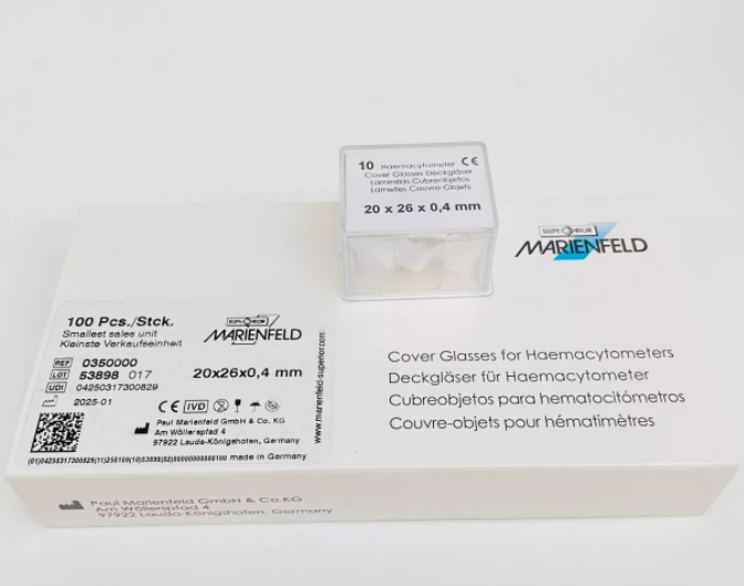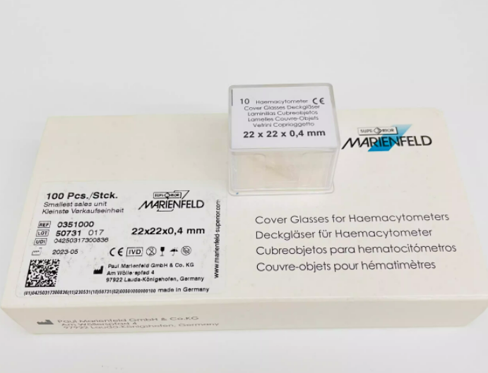 德国原装进口Marienfeld血盖片/细胞计数板盖片/血球计算盘用盖玻片, 硼矽酸玻璃材质制成。