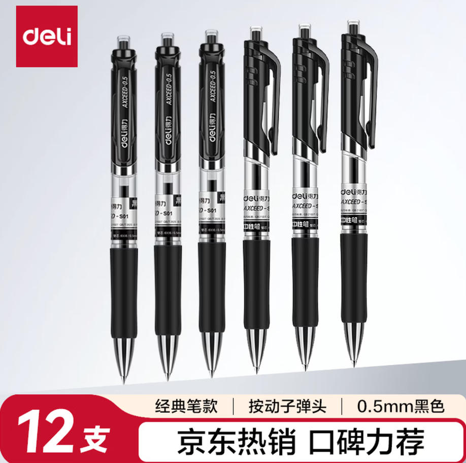 森淼办公 得力(deli)S01中性笔签字笔 0.5mm 经典 办公 按动笔 水笔 黑色 12支/盒