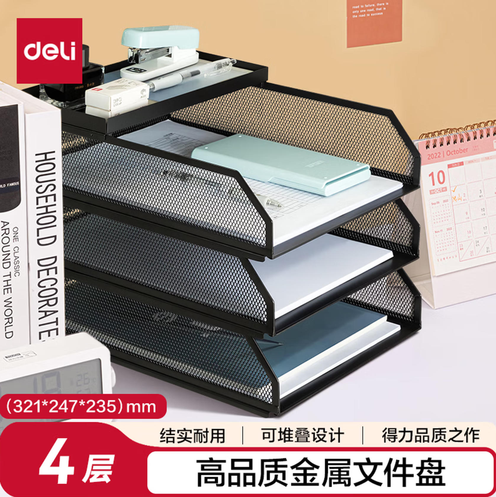 得力(deli)可堆叠 金属文件框栏文件篮文件托盘书立架 多层办公桌面 档案收纳盒 文件筐 置物架 四层黑色 PB260