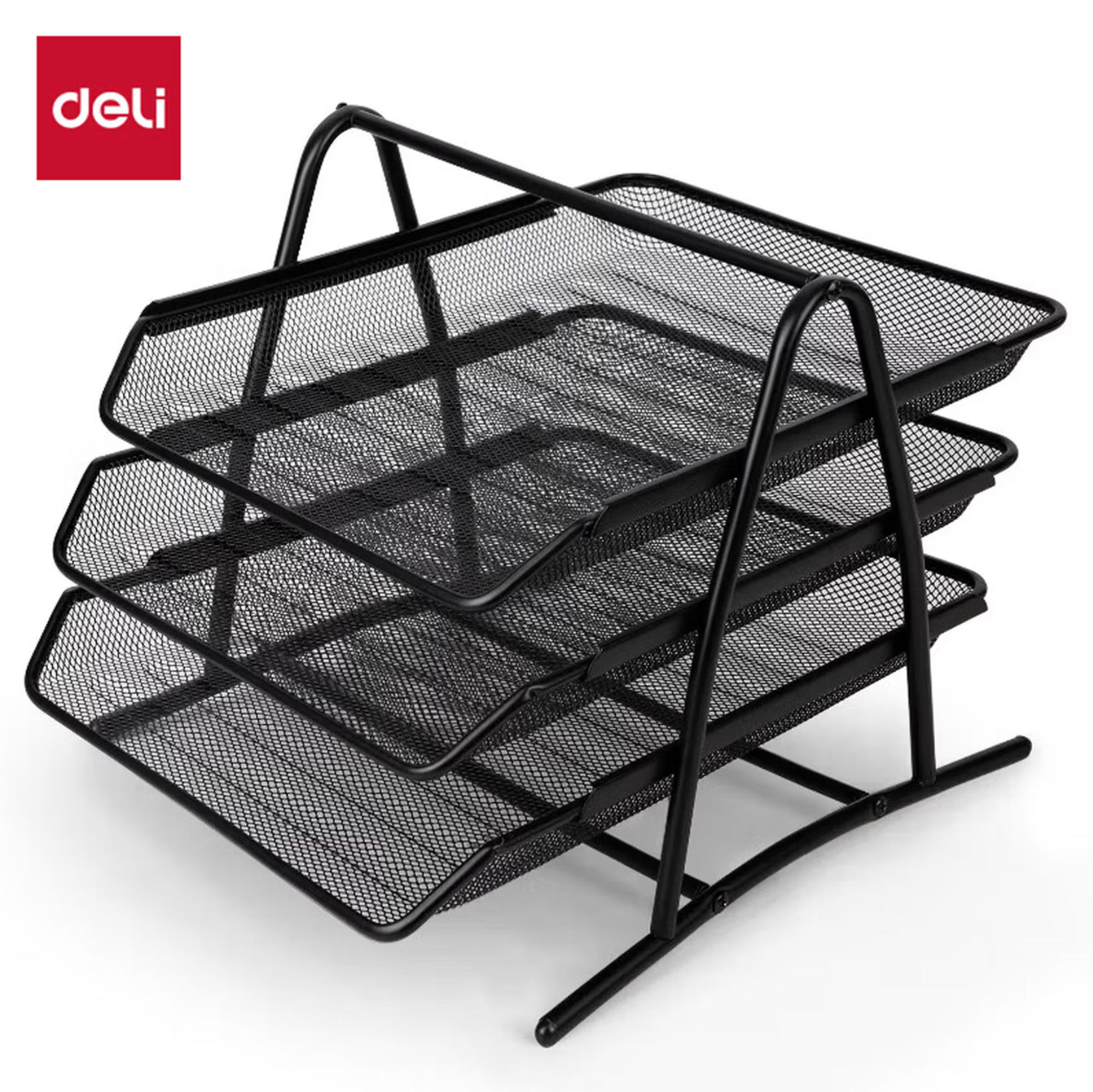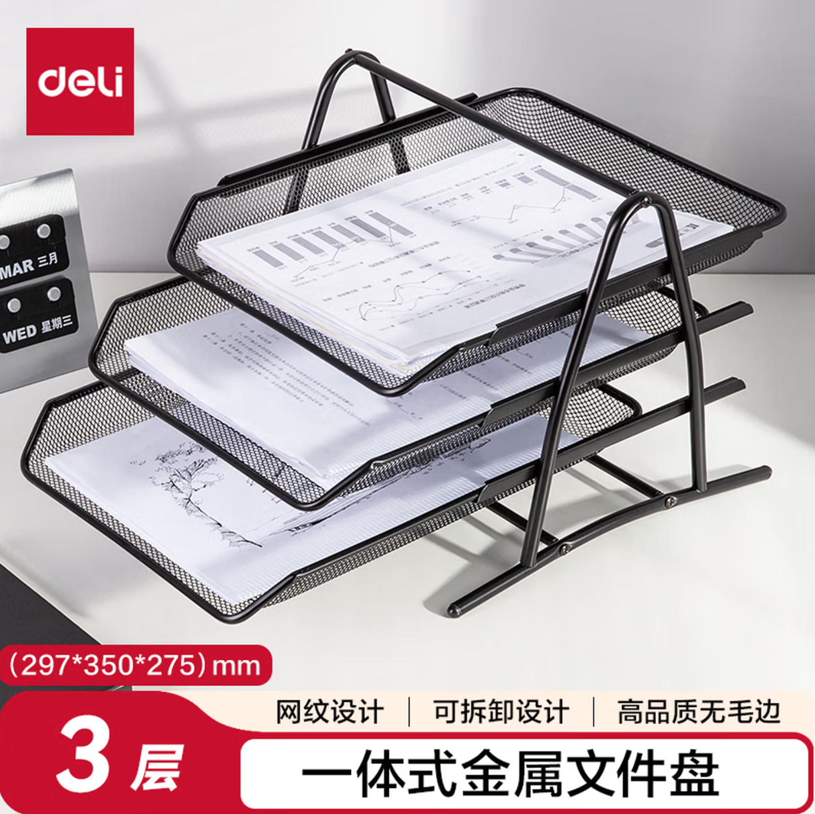 得力 (deli) 商务 三层 金属文件盘 桌面档案收纳盒 文件置物架/资料架/文件篮 托盘可前后移动 黑色 9181