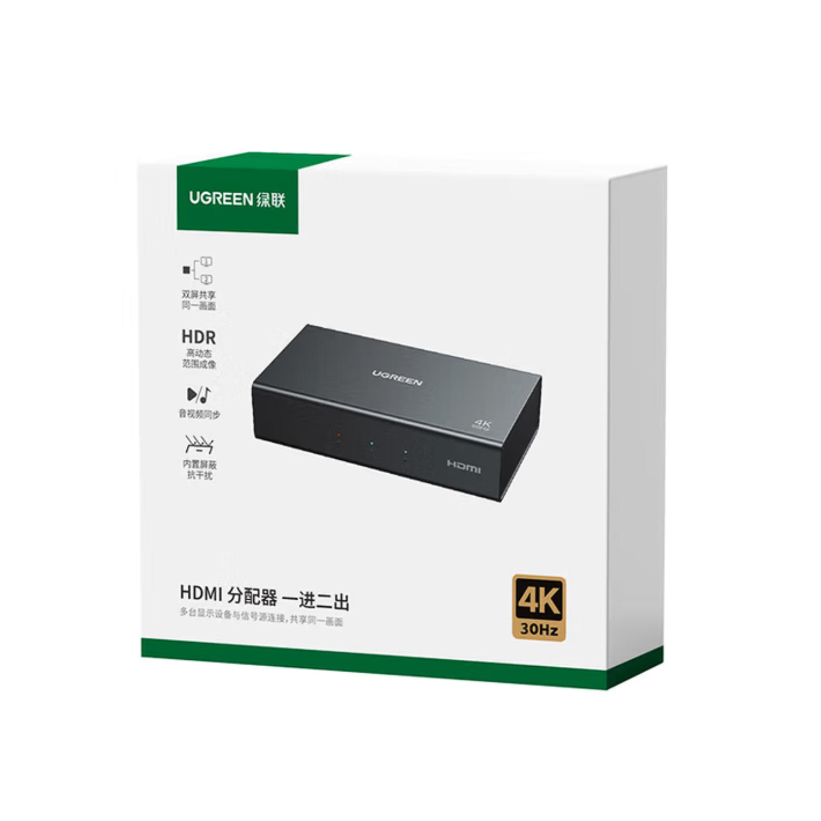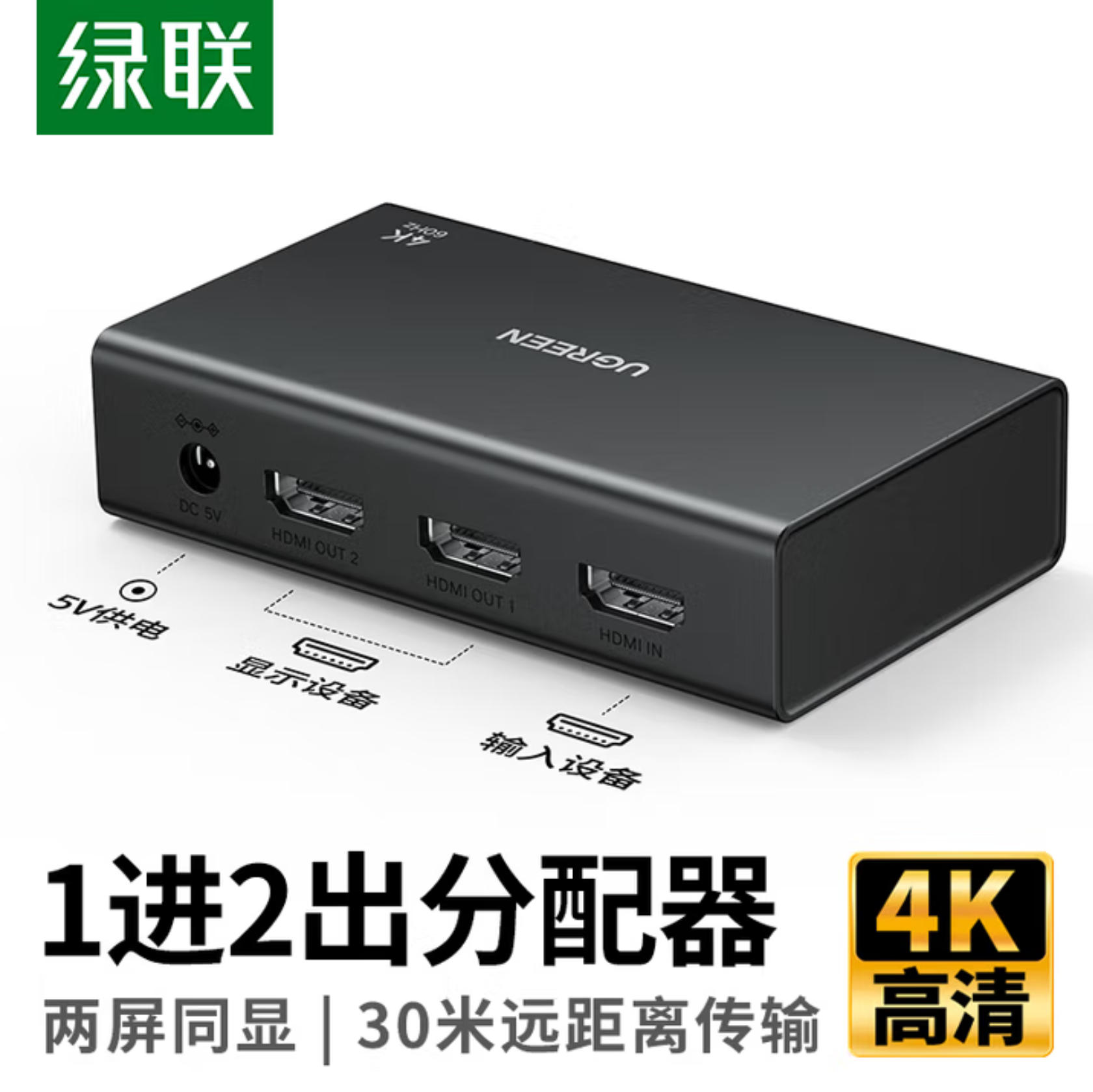 云栖漫心 绿联 HDMI一拖二分配器4K高清 1分2同屏显示 一进二出 视频分屏 扩展 笔记本电脑接电视显示器投影仪90803