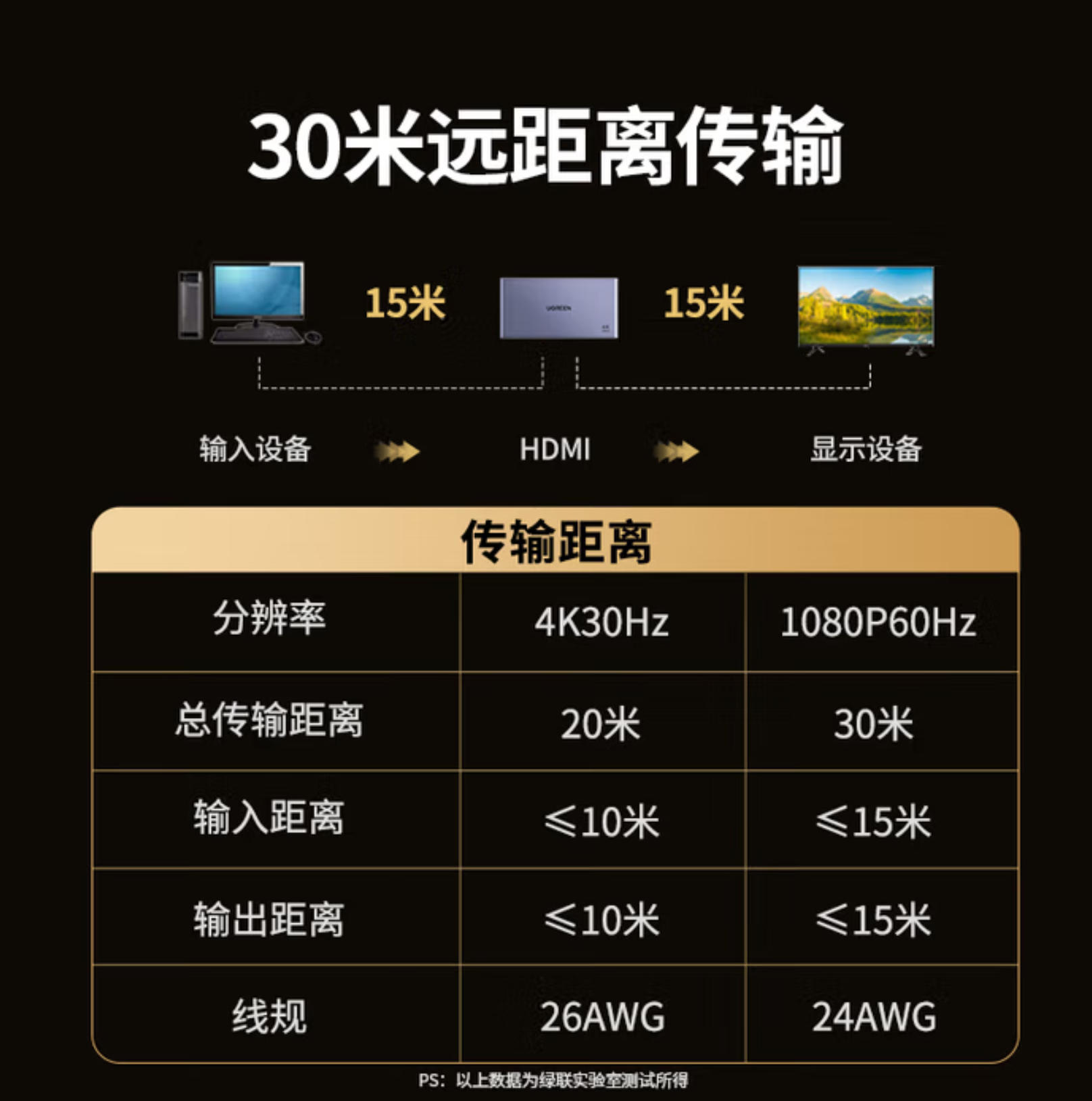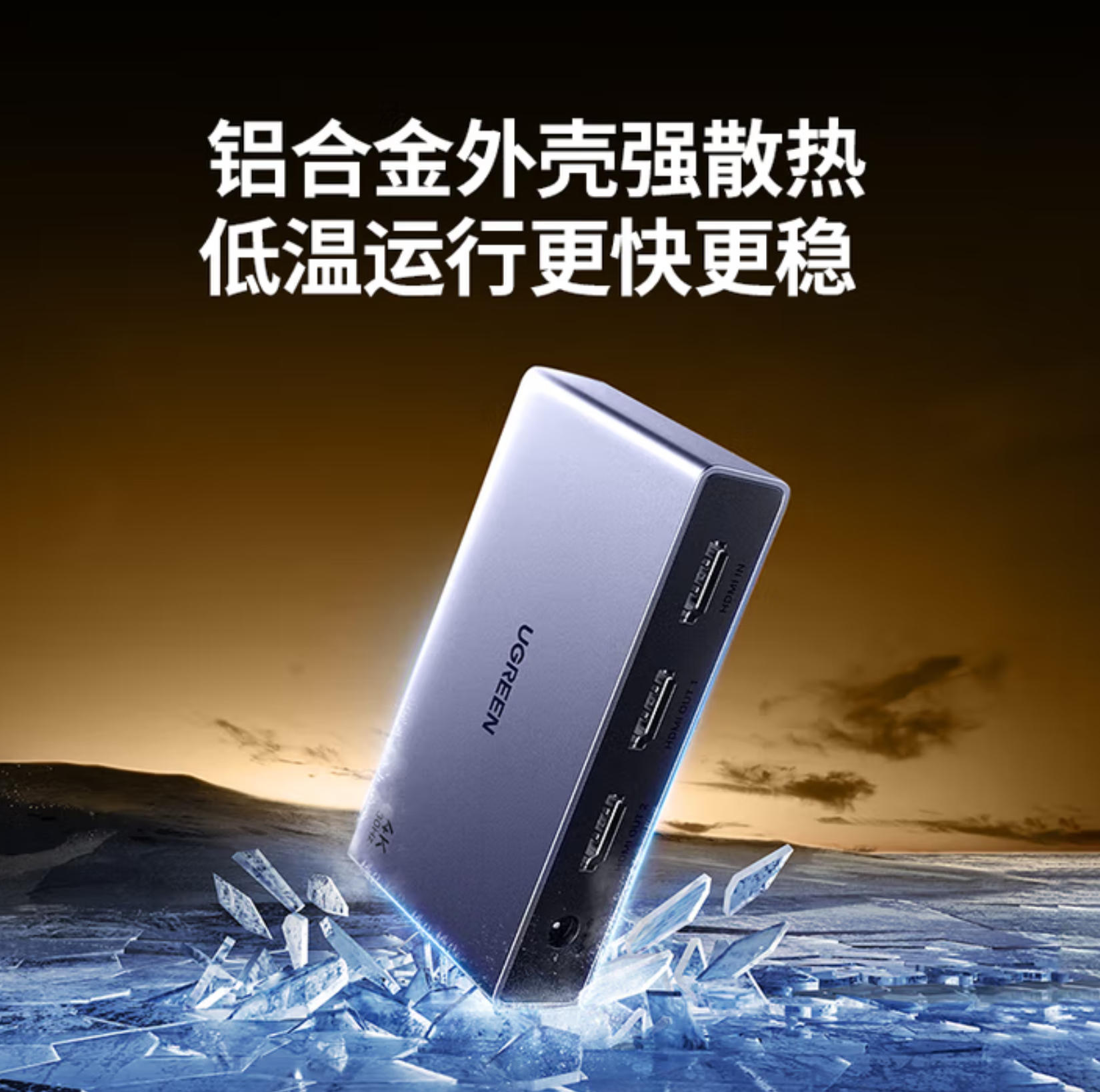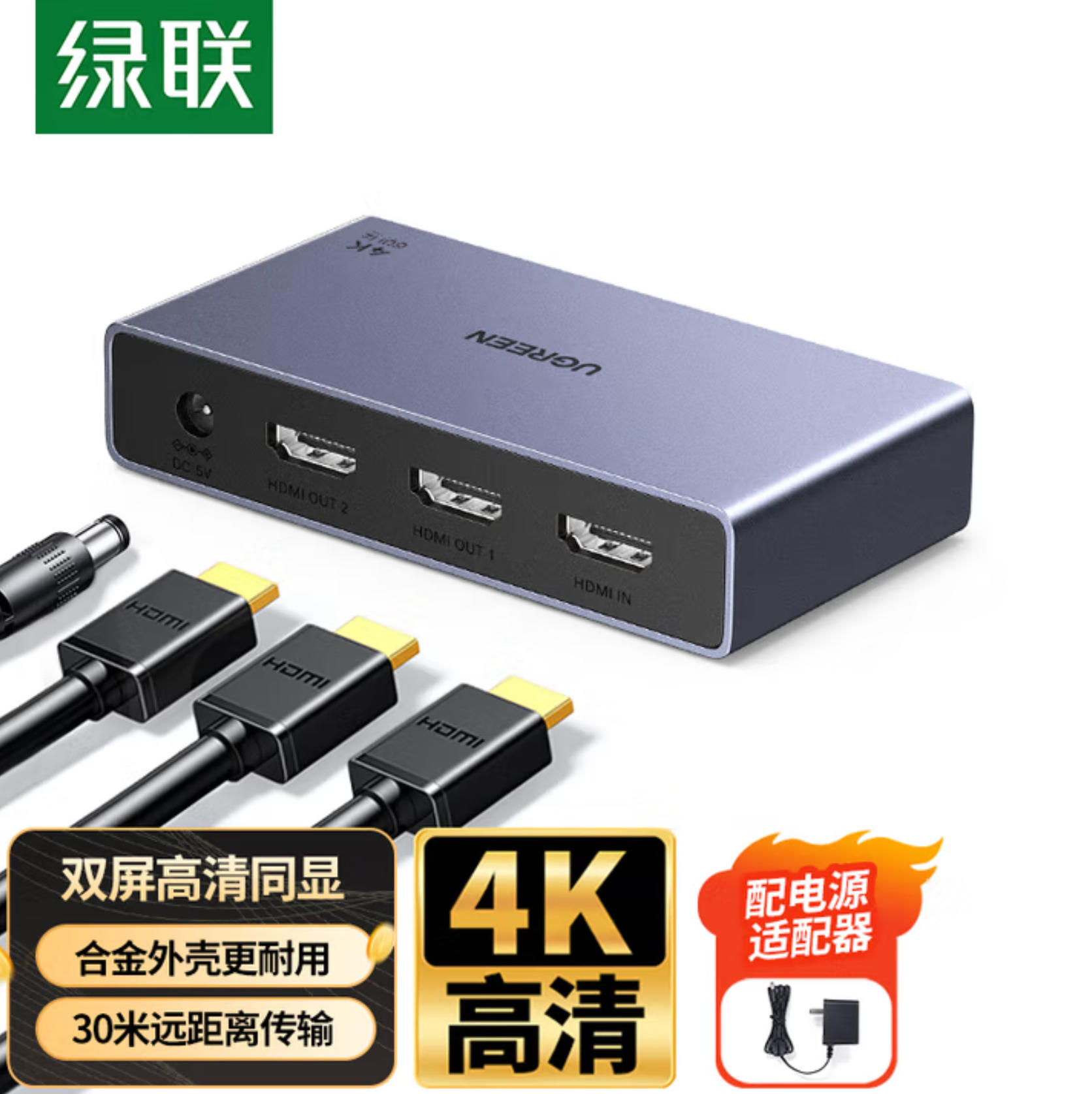 云栖漫心 绿联 HDMI分配器4K高清一分二 1进2出双屏同显一拖二视频分屏扩展笔记本电脑接显示器电视机投影仪55491