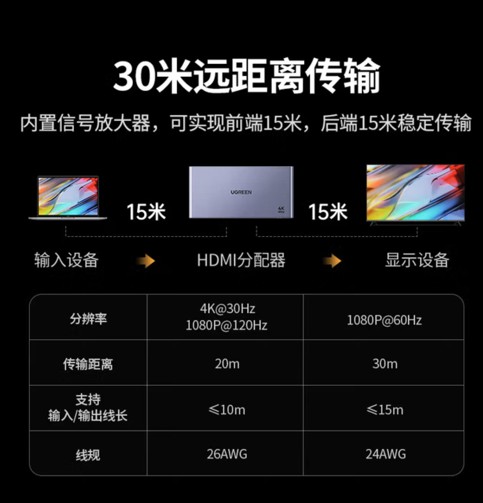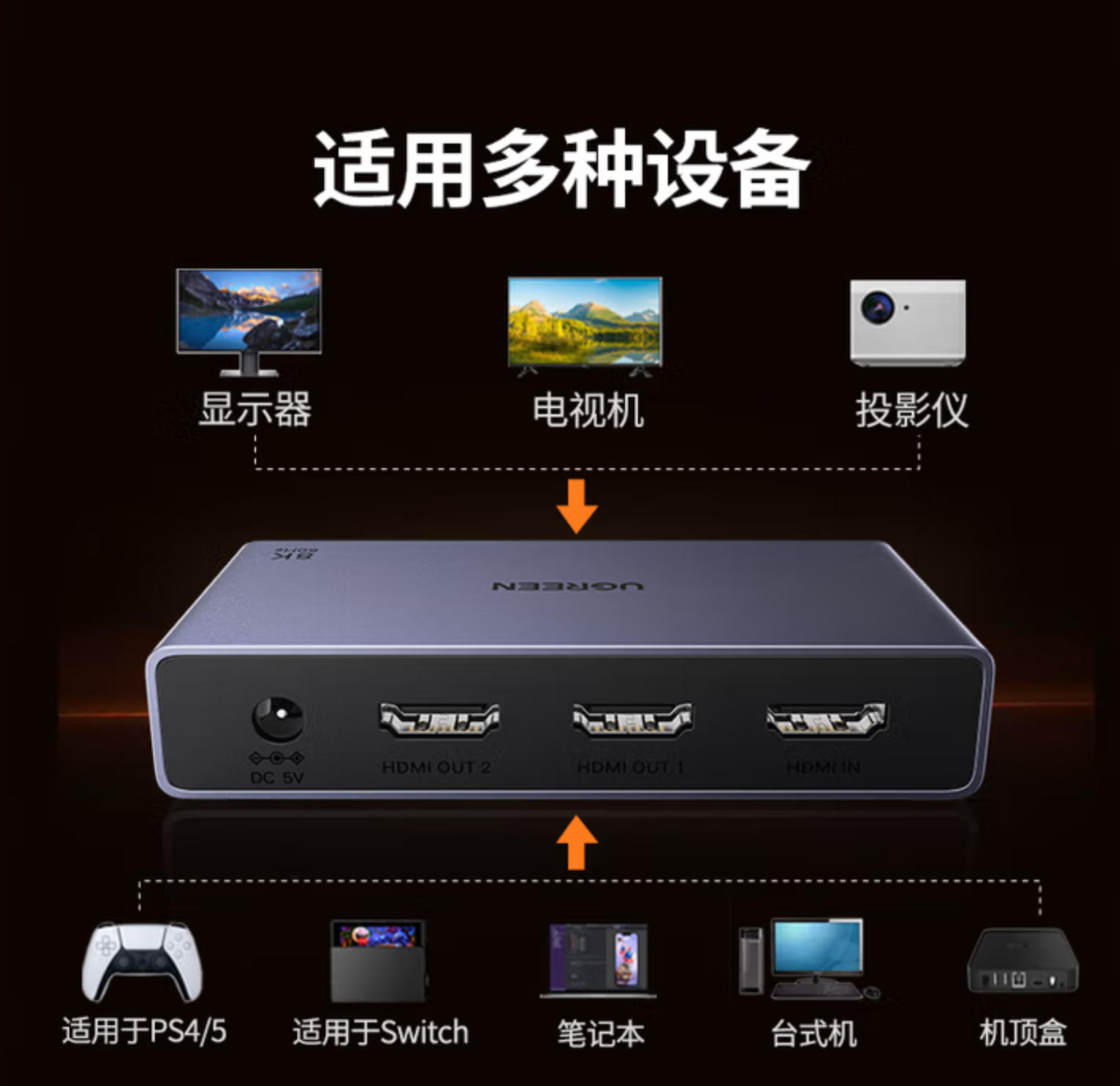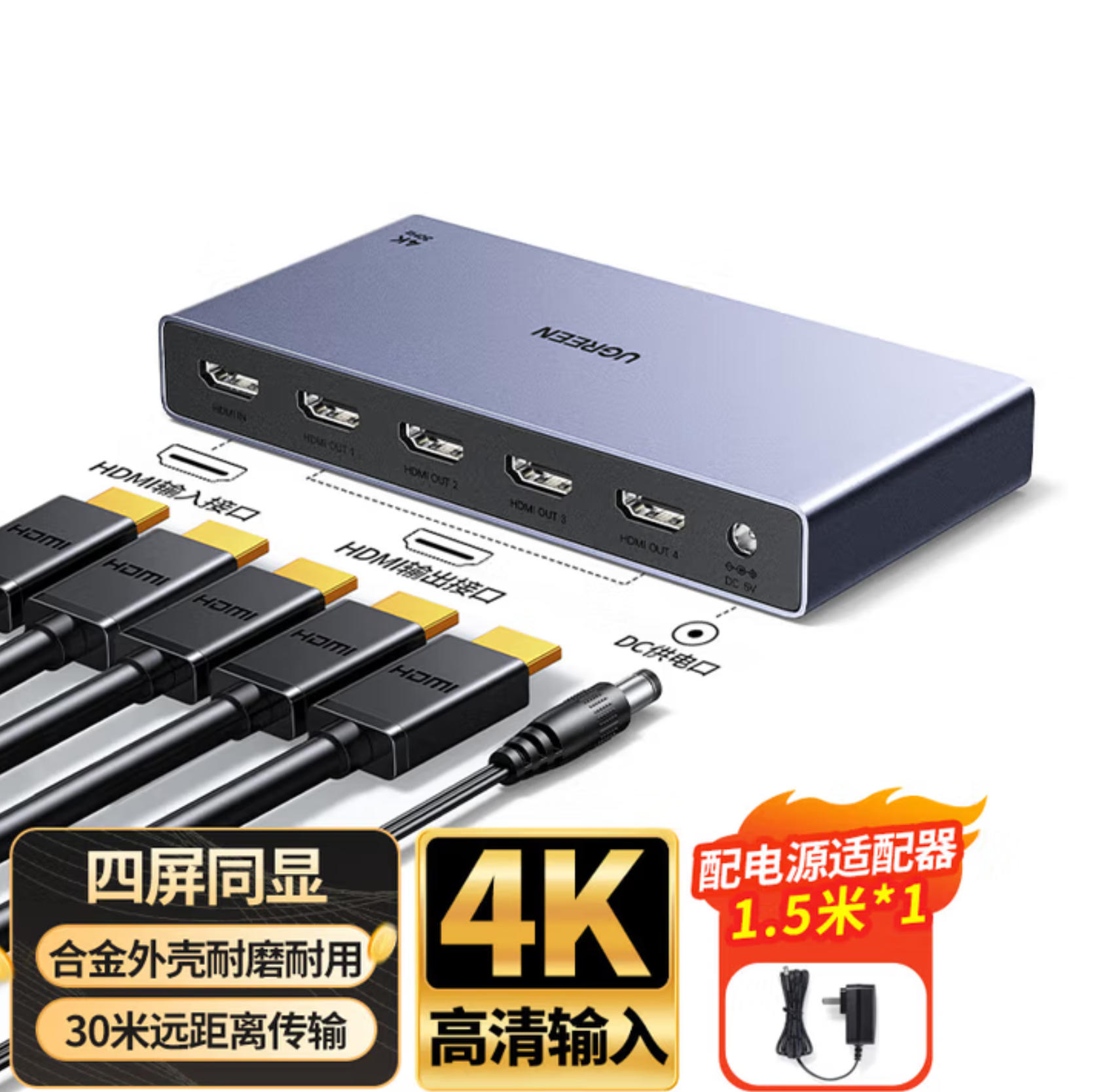 云栖漫心 绿联 HDMI分配器4K高清一分四同屏显示一进四出视频分屏扩展 适用笔记本电脑接电视显示器投影仪55492