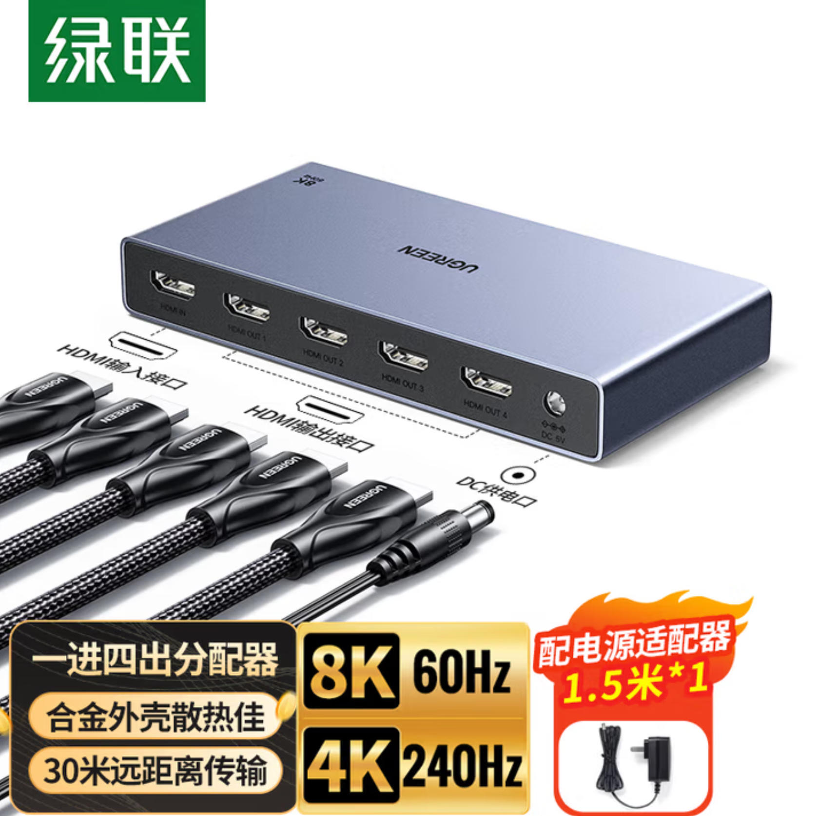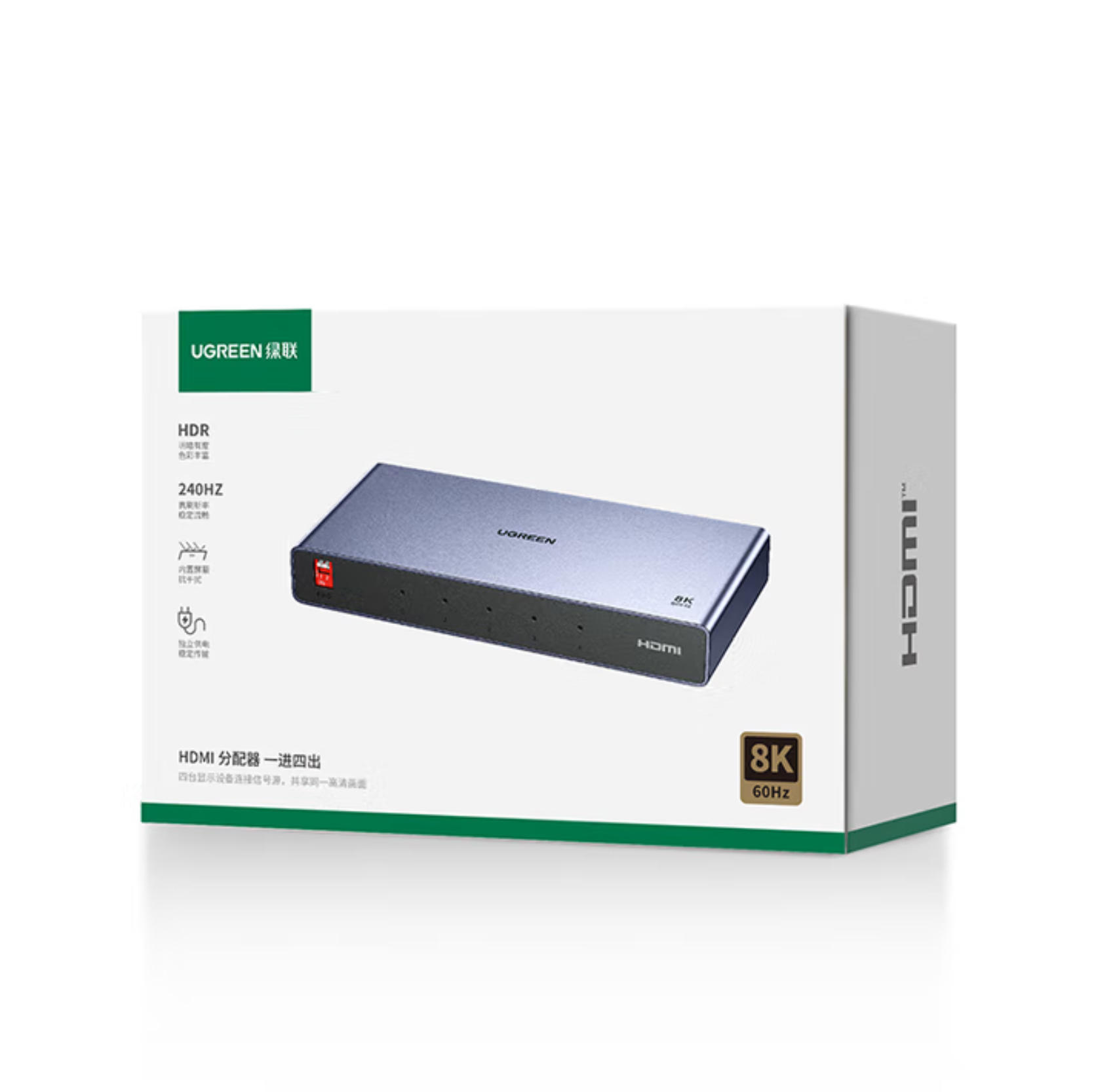 云栖漫心 绿联 HDMI2.1分配器8K60Hz/4K240Hz高清一分四视频分屏1进4出笔记本台式电脑机顶盒接显示器投影仪25858