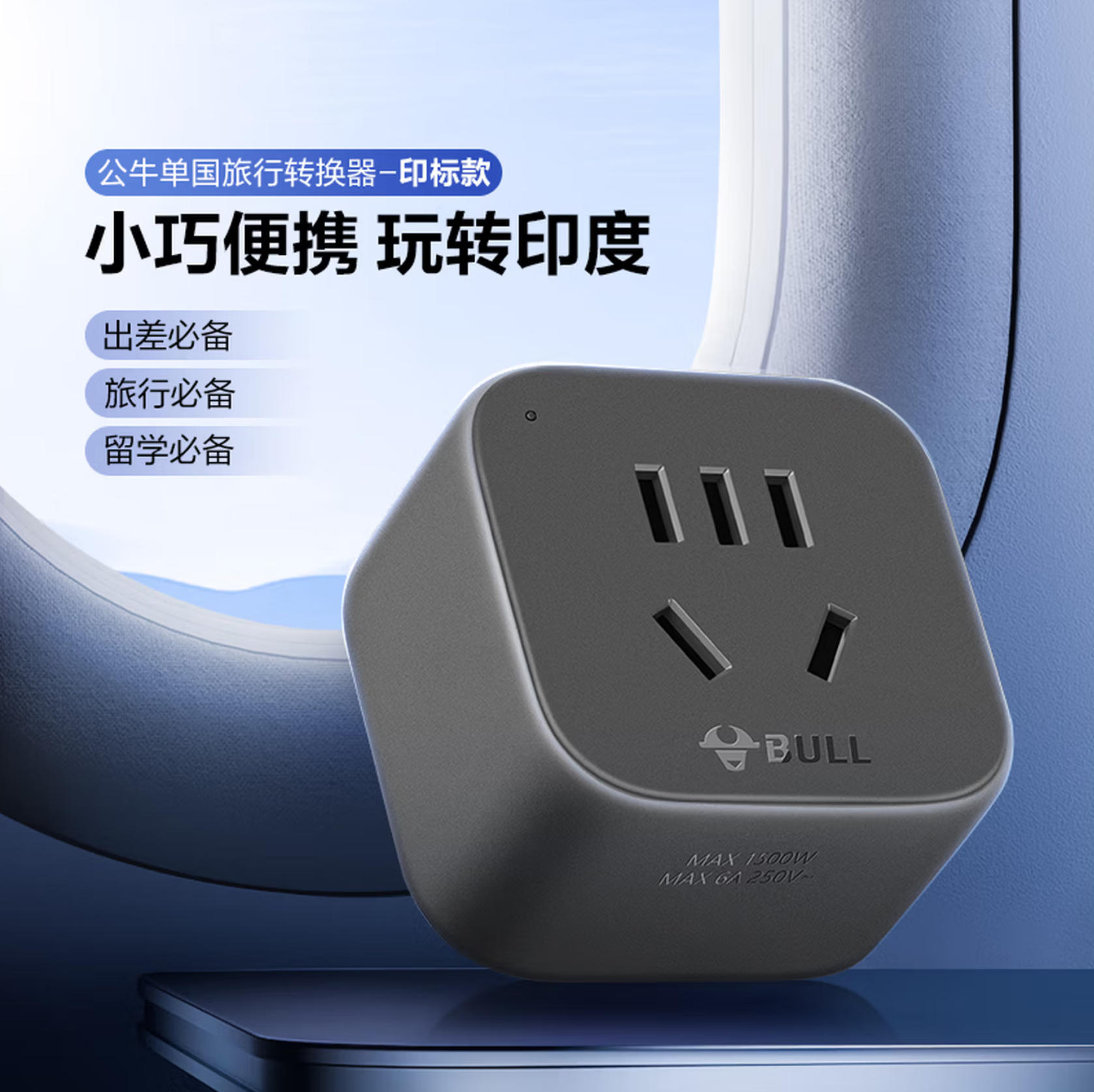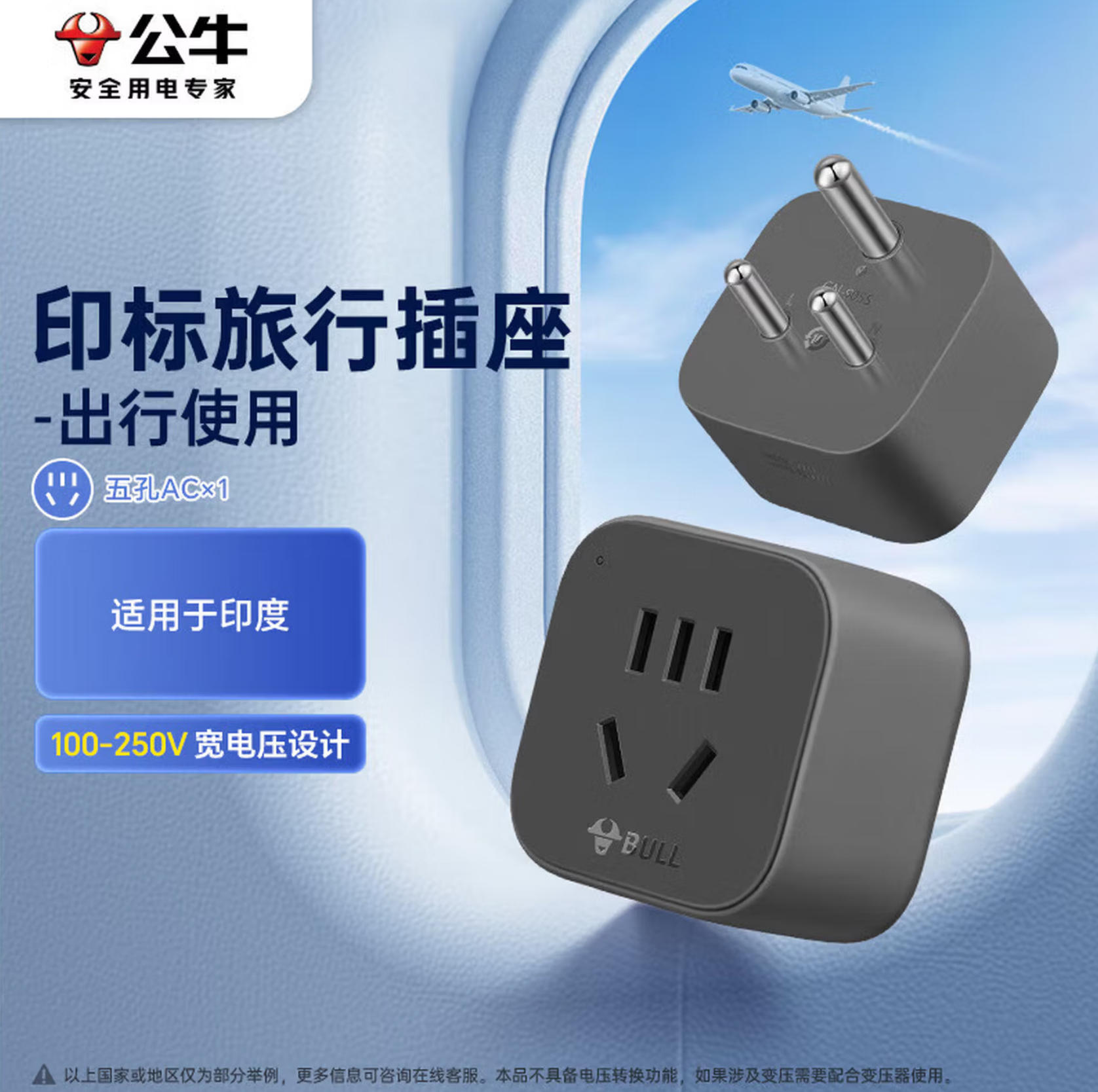森淼办公 公牛(BULL)印标旅行插座电源转换器插座/转换插头 适用印标地区 印度使用 GN-905S无开关