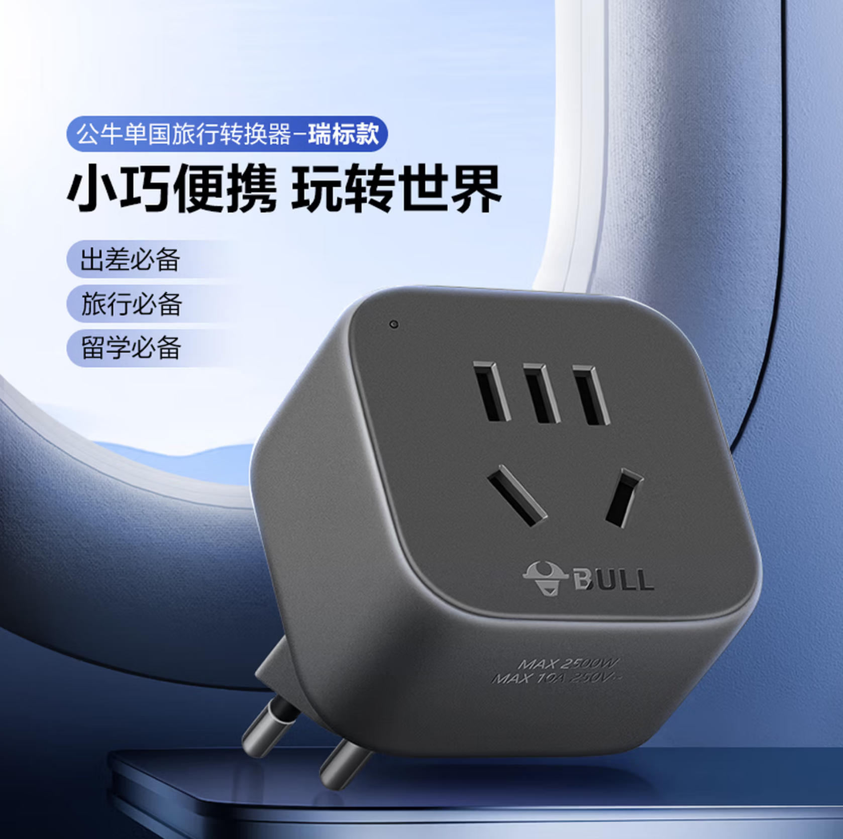 森淼办公 公牛(BULL)瑞标旅行电源转换器插座/转换插头 适合瑞标地区(瑞士 卢旺达 埃塞俄比亚等) GN-905W无开关