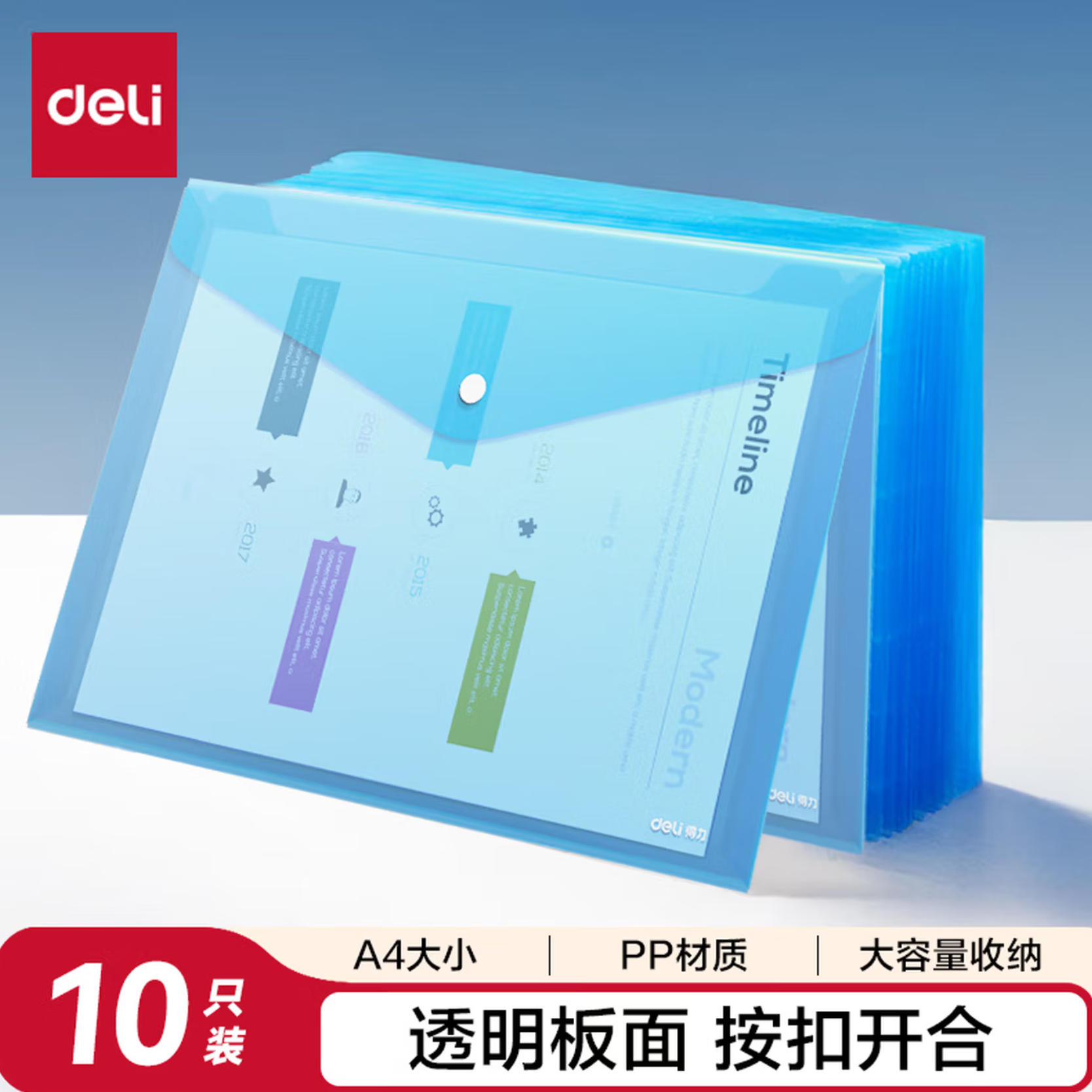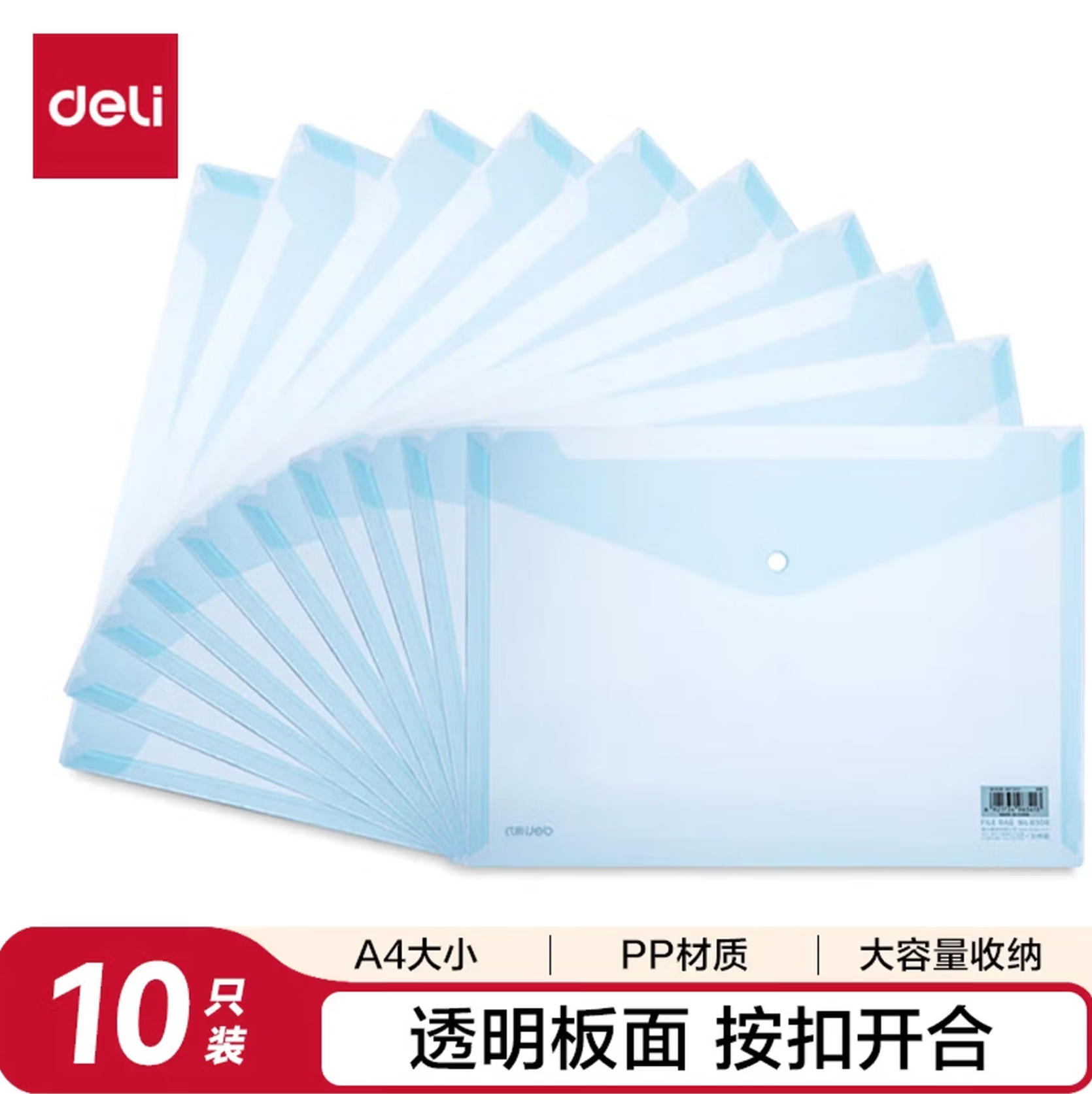 森淼办公 得力(deli)10只A4透明文件袋 按扣资料袋 塑料档案袋 合同标书资料文件保护试卷票据收纳袋 学习用品8308淡蓝色