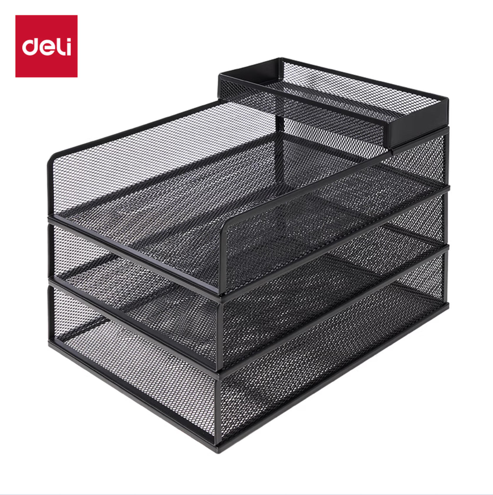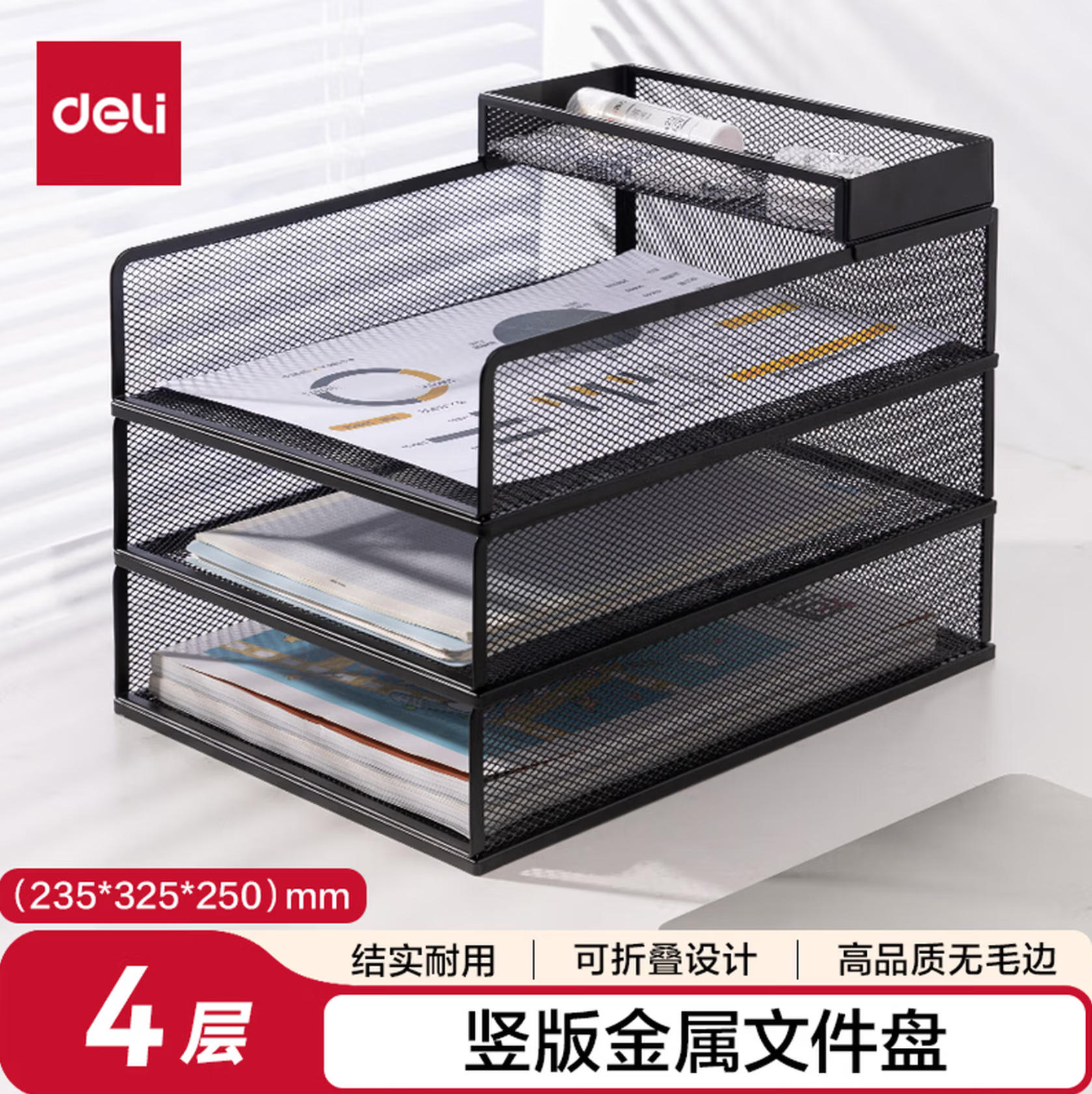 得力(deli)三层竖版金属文件座 办公桌文件架置物架 文件托盘 桌面文件框收纳架 PB265 黑