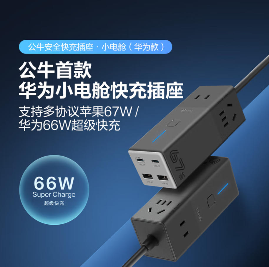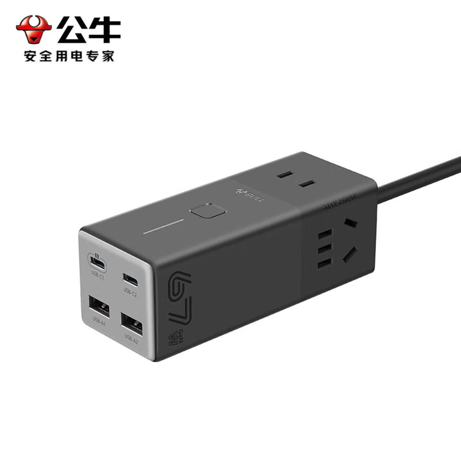 公牛(BULL)67WPD快充插座适配华为66W超级快充/华为mate70/笔记本充电器USB插线板便携插排 2C2A+3位总控开关 GNV-MC1663