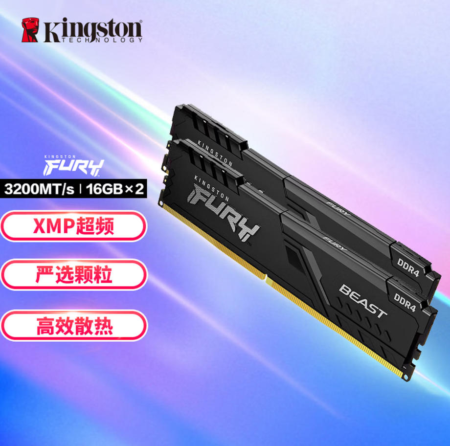云栖漫心 金士顿(Kingston)FURY 32GB(16G×2)套装 DDR4 3200 C16 台式机内存条 Beast野兽系列 骇客神条