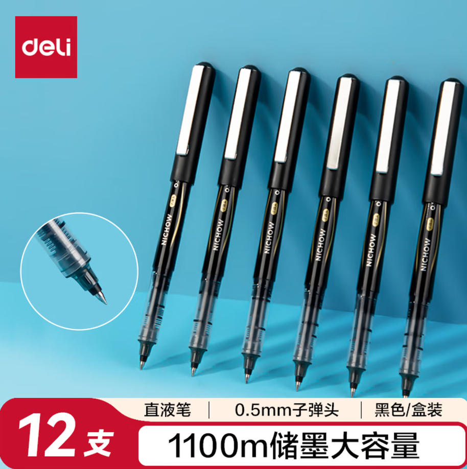 云栖漫心 得力(deli)直液笔 签字笔 0.5mm子弹头 办公商务 中性笔 走珠笔 水笔 会议笔 黑色 12支/盒 S656-Z1