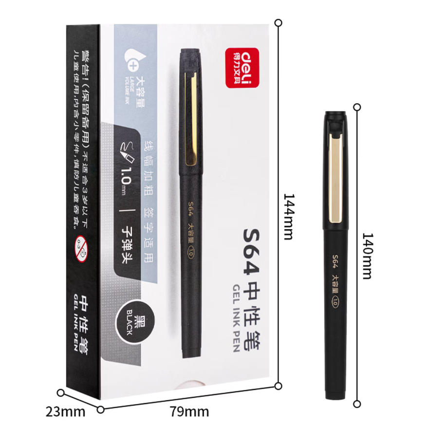 云栖漫心 得力(deli)商务风 大容量 拔帽 中性笔 签字笔 办公办公笔 1.0mm子弹头 12支/盒黑色 S64