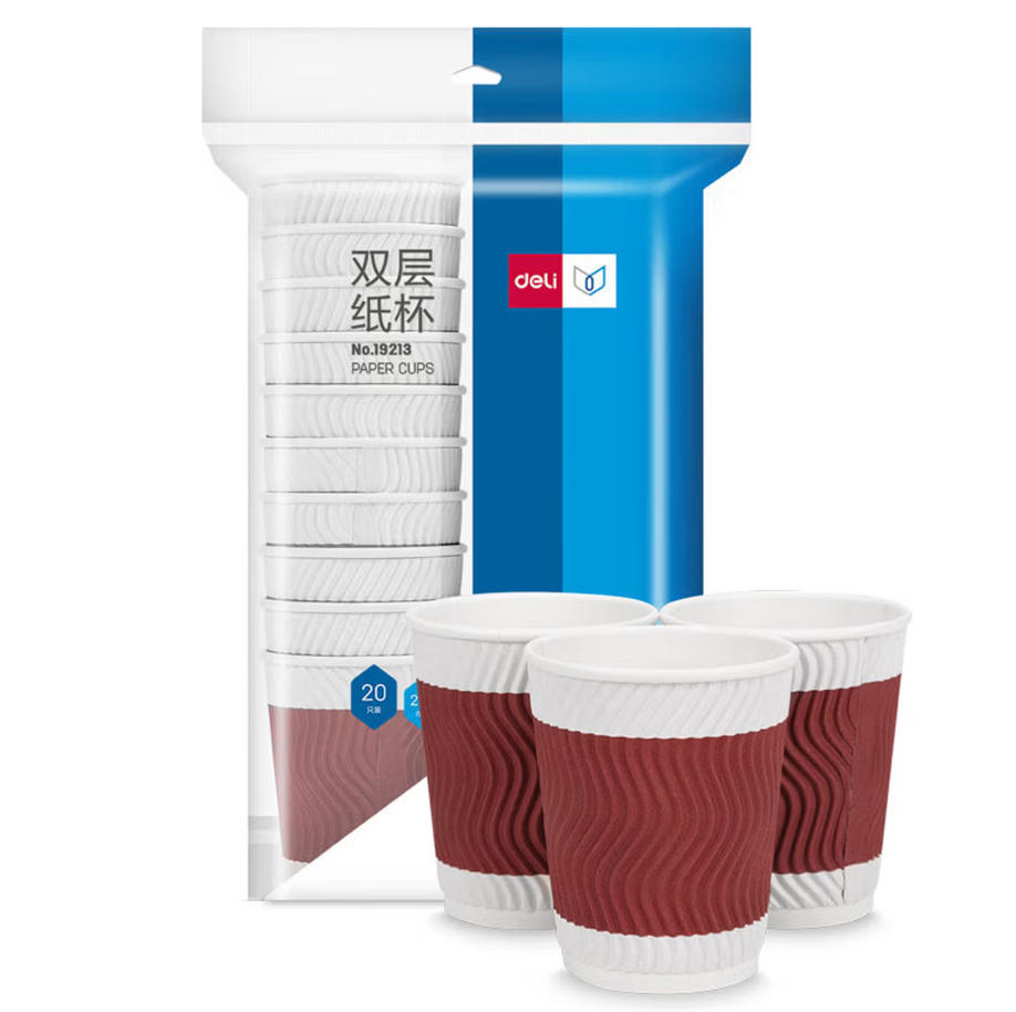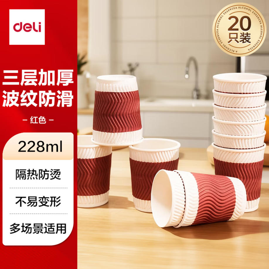 云栖漫心 得力(deli)228ml一次性纸杯 杯子/水杯 防滑三层加厚波纹 红色 20只装