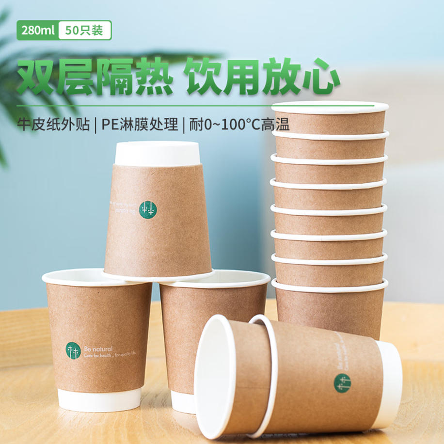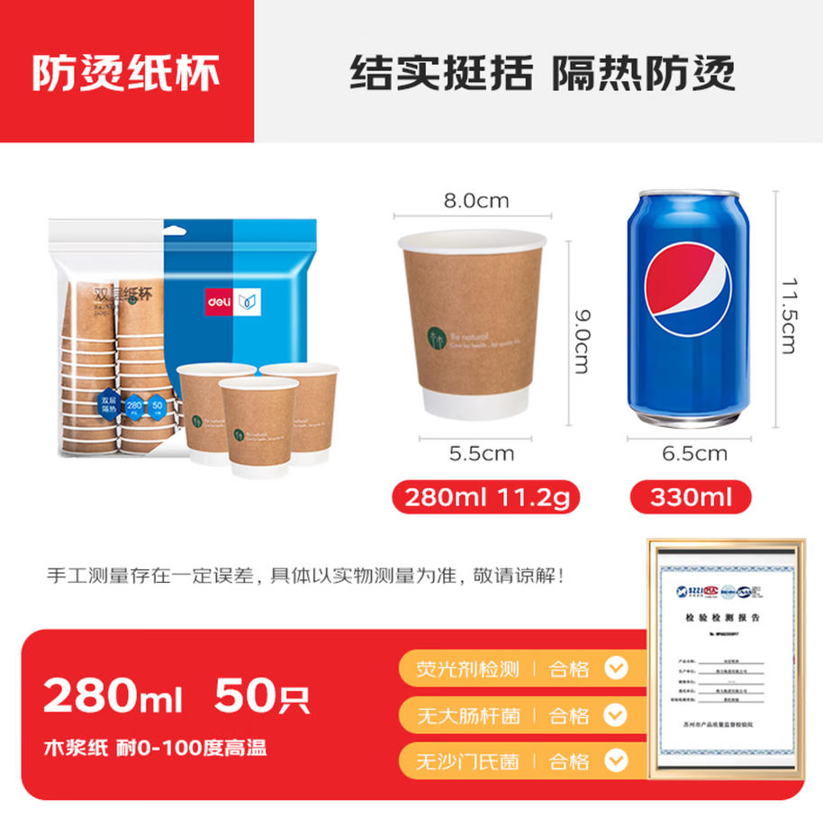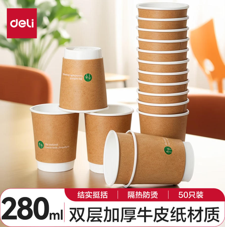 云栖漫心 得力(deli)280ml纸杯 一次性杯 水杯 牛皮纸双层加厚会议 50个装