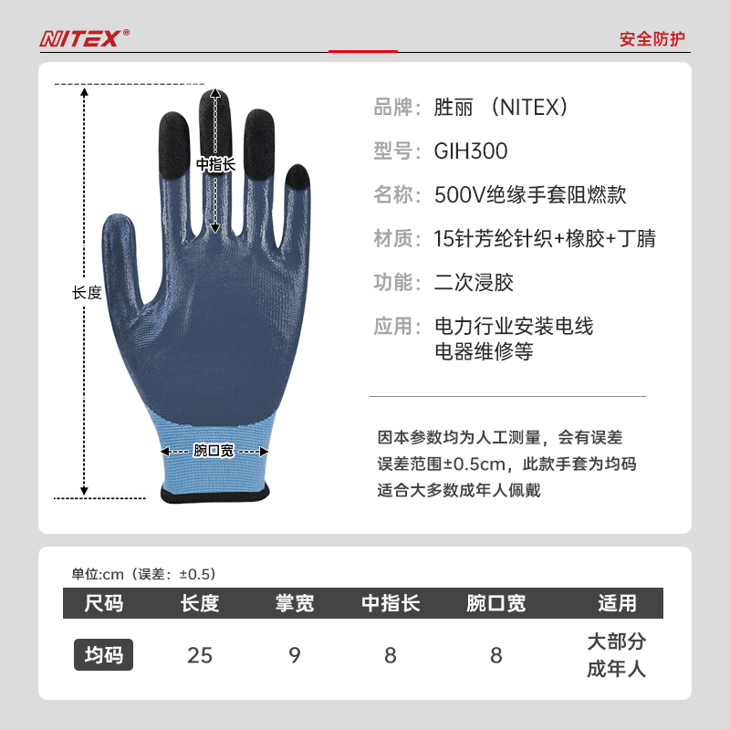 胜丽 (NITEX) GIH300 绝缘手套 500V 阻燃款 最大使用电压450V 不可直接带电作业 出厂开始每半年需要进行一次检测