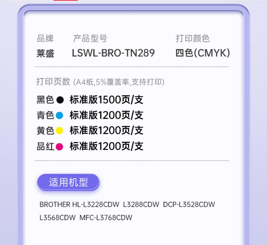 天大赛奇 莱盛TN289彩色粉盒 适用兄弟HL-L3228CDW L3288CDW DCP-L3528CDW粉仓 TN289黑色 经典标准版1500页