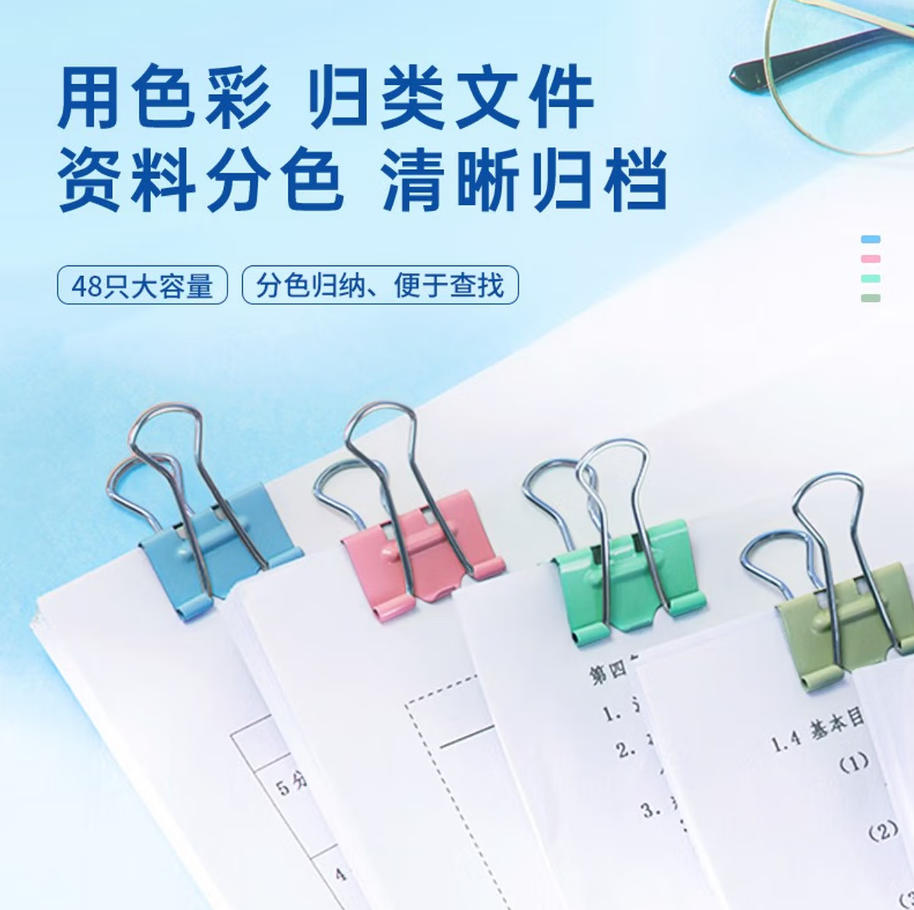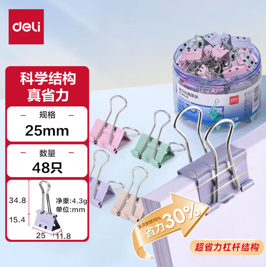 森淼办公 得力(deli)48只25mm省力彩色长尾夹票夹 中号金属燕尾夹票据文件夹 48只/筒 8554S