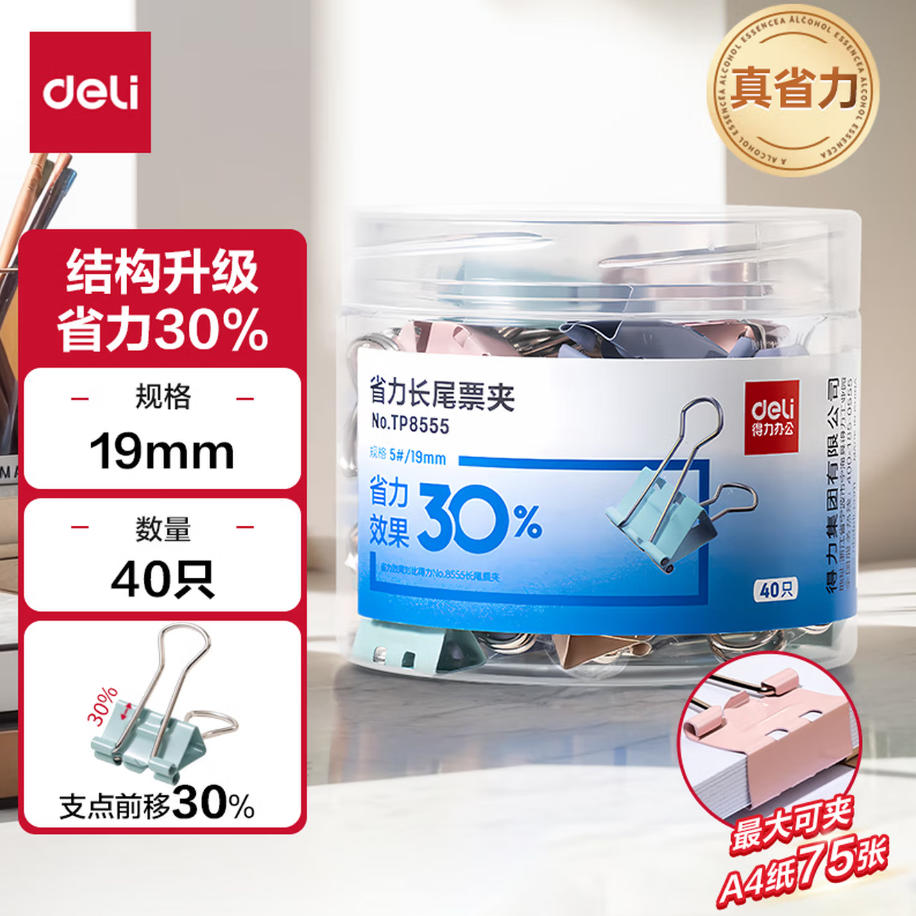 森淼办公 得力(deli)40只19mm彩色长尾夹省力票夹 5#小号金属燕尾夹 办公用品 40只/筒TP-8555ES