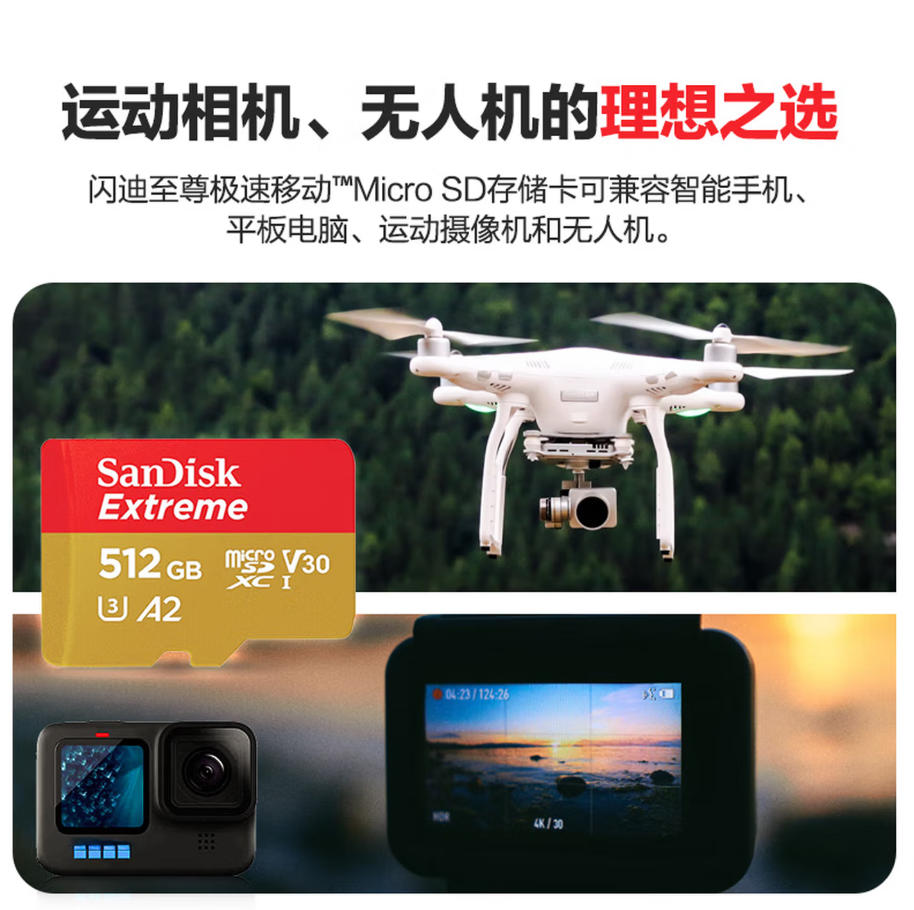 云栖漫心 闪迪(SanDisk)512GB TF(MicroSD)内存卡 4K极速金卡A2 V30 U3行车记录仪 运动相机无人机 监控存储卡 读190MB/s