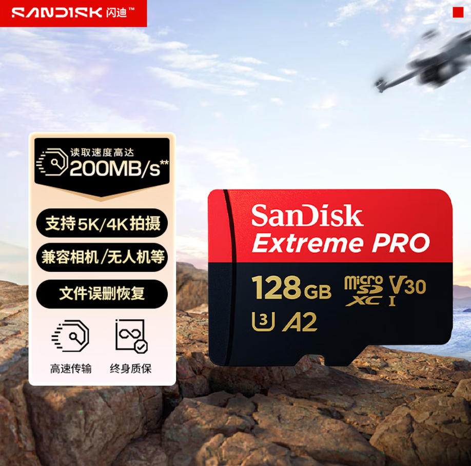云栖漫心 闪迪(SanDisk)128GB TF(MicroSD)内存卡A2 4K V30 U3 C10 至尊超极速移动存储卡 读速200MB/s 写速90MB/s