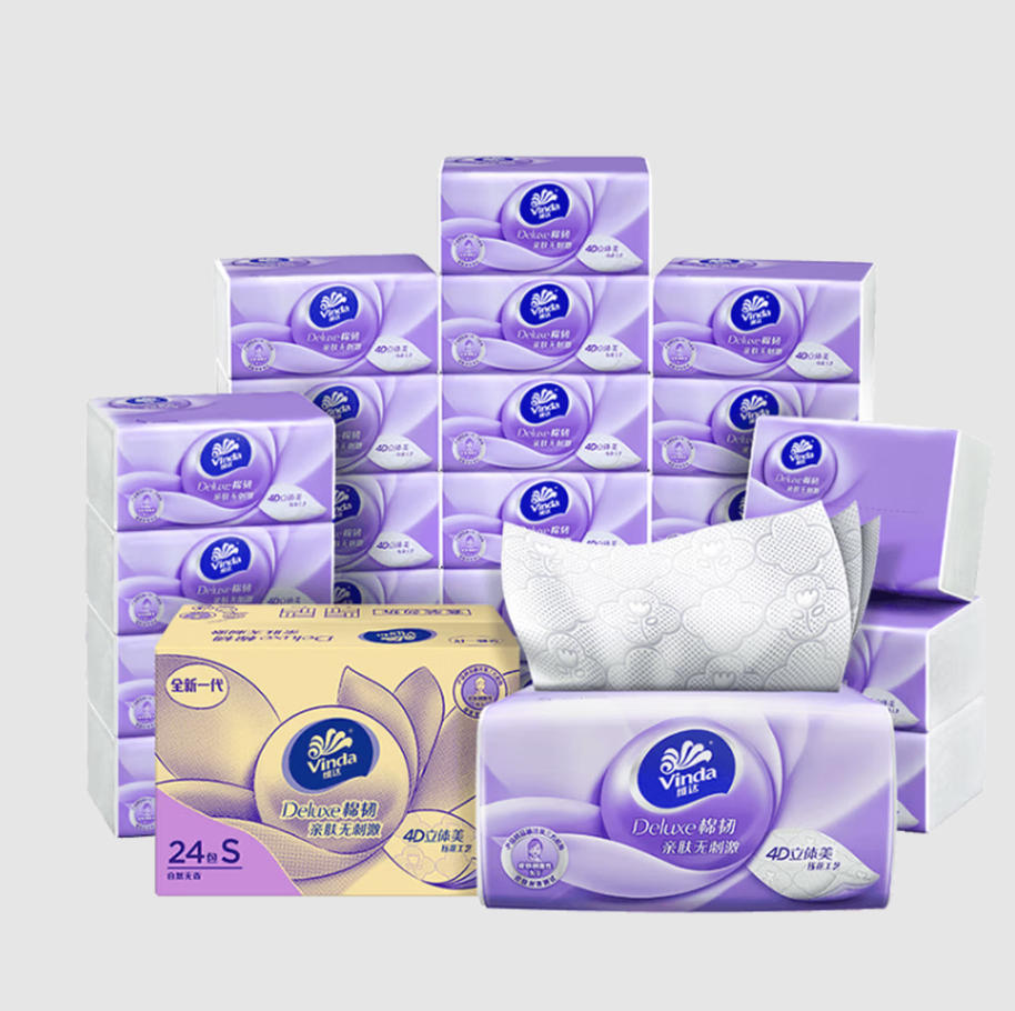 云栖漫心 维达(Vinda)抽纸 棉韧3层108抽*24包S码 亲肤无刺激 卫生纸 纸巾 餐巾纸 整箱