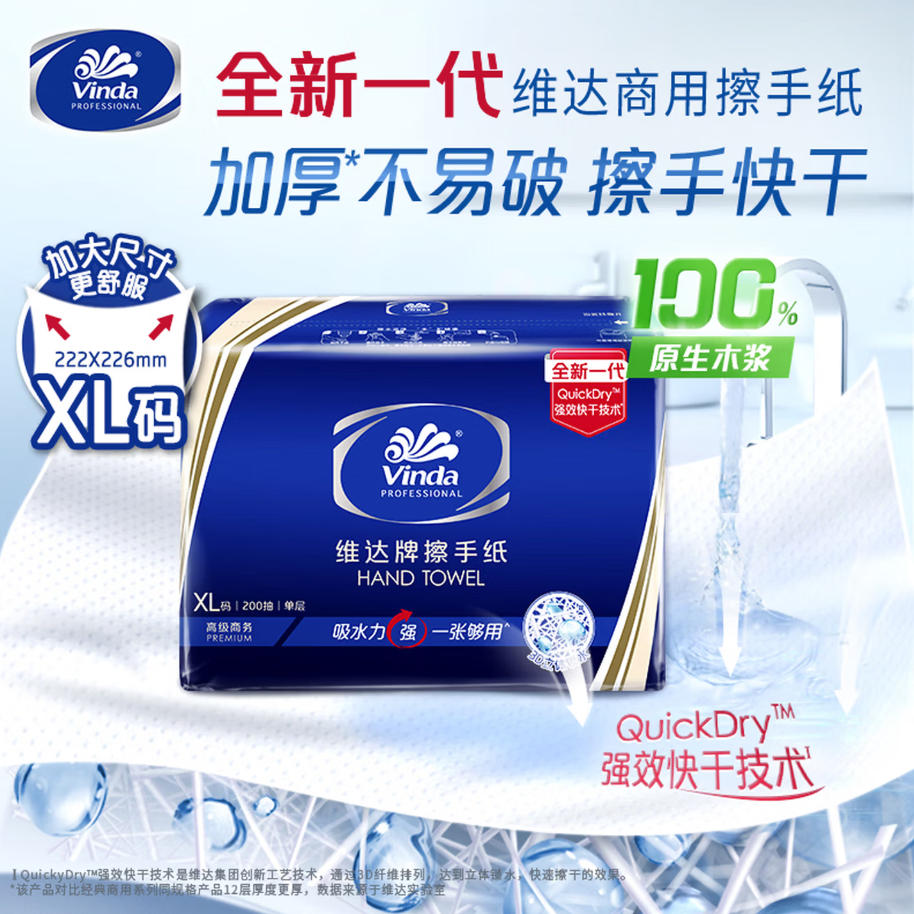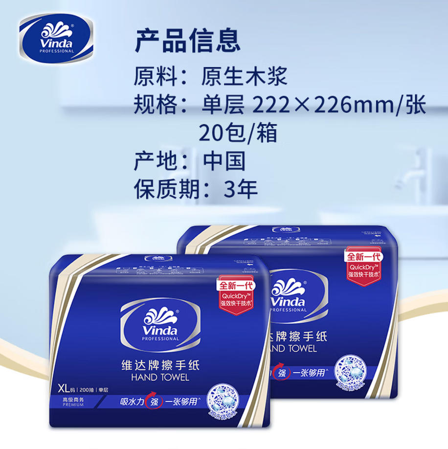 云栖漫心 维达 擦手纸 单层200抽*20包XL码 加大 实验室 商用 抽纸巾整箱 VS2056