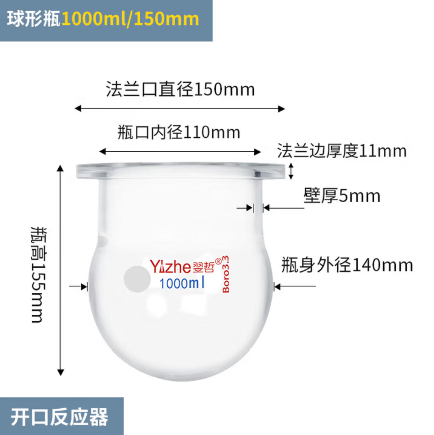 云栖漫心 玻璃反应釜三四口圆底烧瓶反应釜分体式单层玻璃玻璃开口反应器球形圆底筒形平底圆底250/500 球形瓶1000ml/150mm