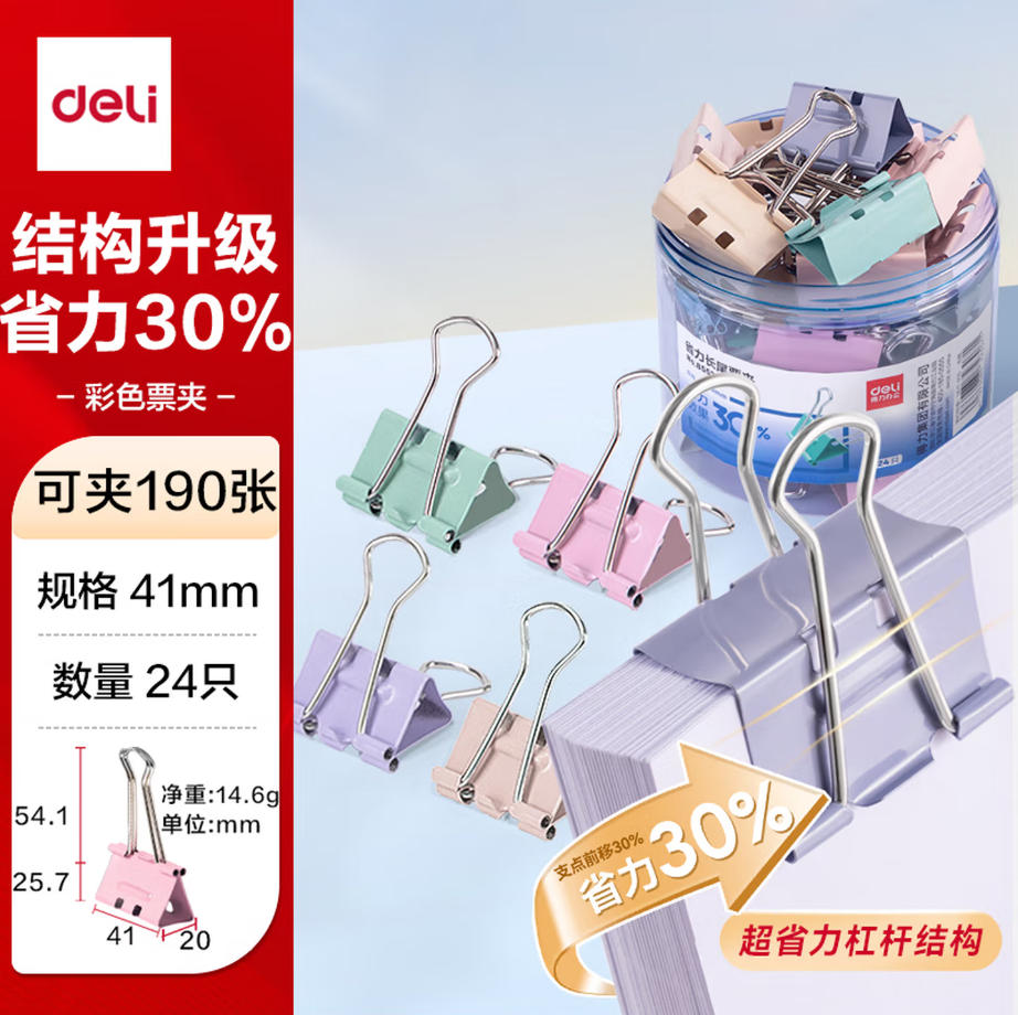 森淼办公 得力(deli)24只41mm省力彩色长尾夹票夹 2#大号金属燕尾夹票据文件夹子 办公用品 24只/筒 8552S
