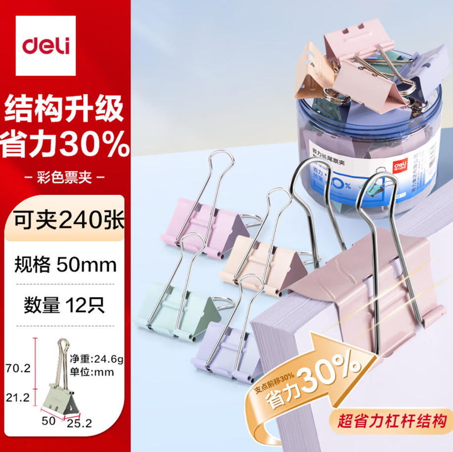 森淼办公 得力(deli)12只50mm省力彩色长尾夹票夹 1#超大号金属燕尾夹票据文件夹子 办公用品 12只/筒 8551S