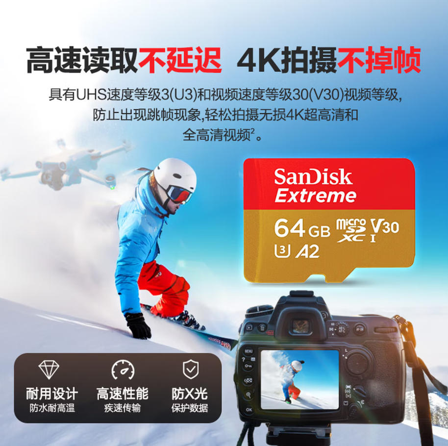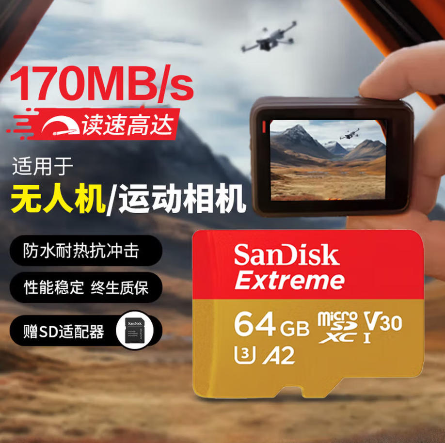 森淼办公 闪迪(SanDisk)64GB TF(MicroSD)内存卡 4K极速金卡A2 V30 U3行车记录仪 运动相机无人机 监控存储卡 读170MB/s