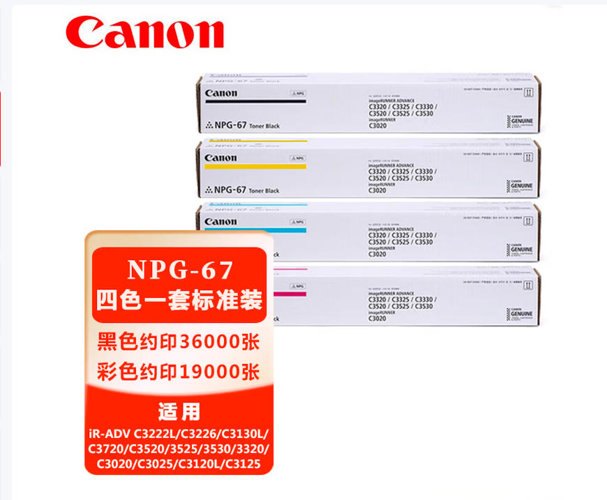佳能(Canon)原装NPG-67 墨粉盒高容四色一套大容量硒鼓(适用C33/35/3020/25/3120/3125/37系列/3226/3222/3130/38系列)黑色36000页,彩色19000页(定点采购)