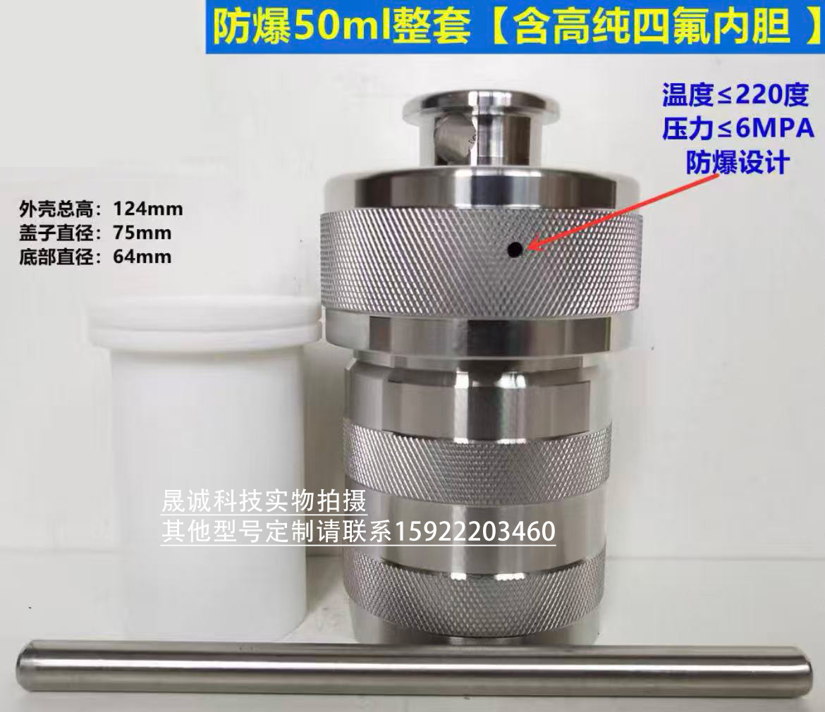 外体材料为优质不锈钢,内杯材料为聚四氟乙烯。水热合成反应釜采用圆形榫槽密封,手动螺旋坚固即可达到密封效果,确保*密封不泄露。另可定做各种规格内胆(聚四氟乙烯内衬杯),需要来图或来样加工。如有任何需求请联系晏经理:15922203460